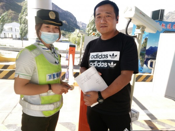 事情是这样的:9月20号,一辆车牌号为冀B1388A的车主将身份证及其钱物掉落在我站车道内,当班收费员井红红在打扫车道卫生时发现了遗落的物品,在看到丢失的物品中有身份证时,灵机一动,想了一个办法,她联系上了交警,根据该车辆牌照找到车主联系方式,并请求他们帮忙寻找失主。交警同志们通过努力联系到了失主。井红红为了保险起见,在下班后,将身份证及钱物转交给了接班的收费班长,让其确认后归还给失主。于是百里峡收费站便出现了上面那一幕场景。