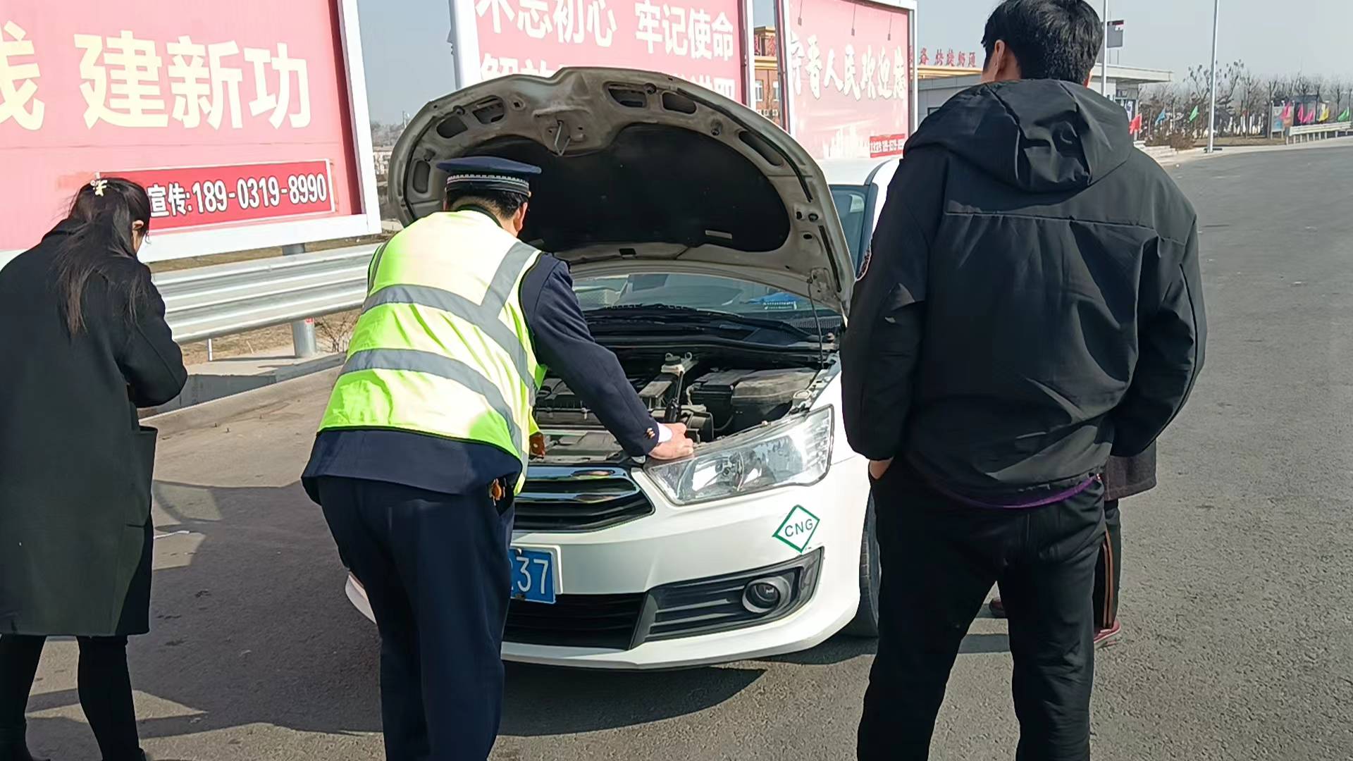 2月12日11时,正值春节假期,宁晋东收费站收费一班值岗,副班长张金强发现收费广场停留了一辆打开前机盖的小型轿车,张金强意识到车辆可能出现了故障,马上上前询问。