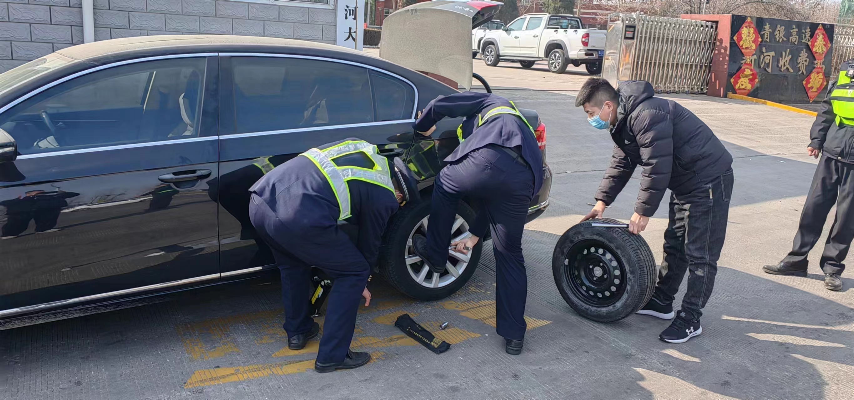 2024年2月17日,春节假期最后一天,是春节返程高峰,新河收费三班正在收费广场忙碌着疏导车辆,此时一辆救援车辆拖着一辆小车停在了广场上,班长李庆龙立即上前询问情况,原来小车在高速上爆胎,因为车上没有工具,无法更换,车主求助救援部门,将车辆拖下高速,再找修理厂进行更换轮胎,李庆龙听到此情况说,我们这有工具,你不用找修理厂了,我们帮你更换轮胎,班长李庆龙和疏导员李凯凯马上拿过来工具就更换起来。