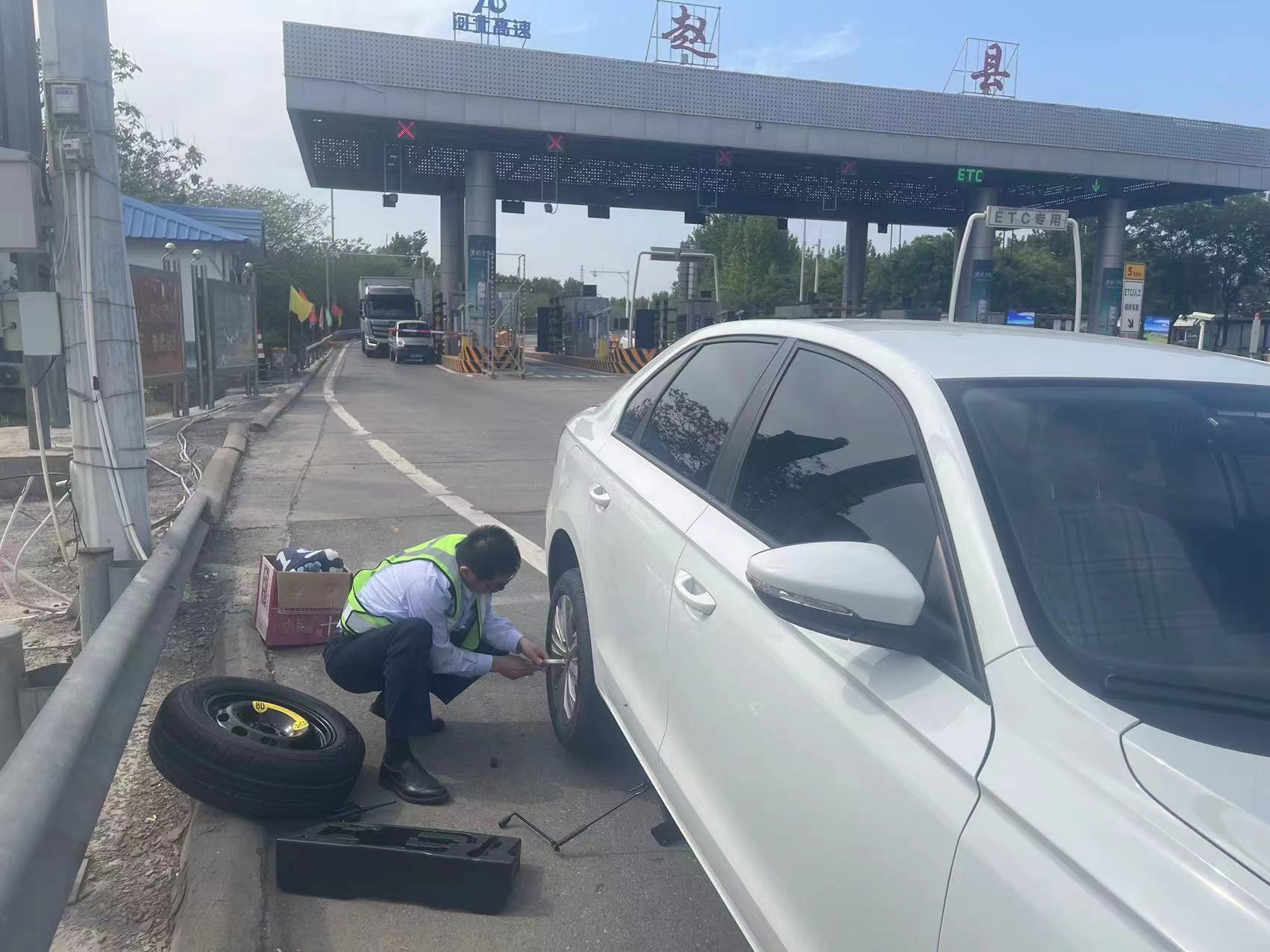 5月5日下午两点左右,正值五一节假日最后一天,赵县收费站下道车辆较多,班长李永盛正在广场疏导车辆,此时一辆冀A牌照的小型客车在经过李永盛身边时,司机摇下车窗询问附近修补轮胎的维修点的位置,班长李永盛看着司机焦急的神情,心里猜测肯定是这位司机师傅遇到了什么问题,他便示意司机先将车辆停靠在广场安全区域,了解到该车返程途中胎压报警,检查发现轮胎扎着一枚钉子,李永盛连忙安慰司机,并表示可以先帮司机更换备胎,再前往修理店,经过一番操作,备胎很快就被换好了,司机竖起了点赞的大拇指,不停表示感谢,李永盛又将附近修理店地址告知司机,并表示这些都是我们应该做的,下次在高速路上遇到什么困难都可以向我们青银收费站求助。