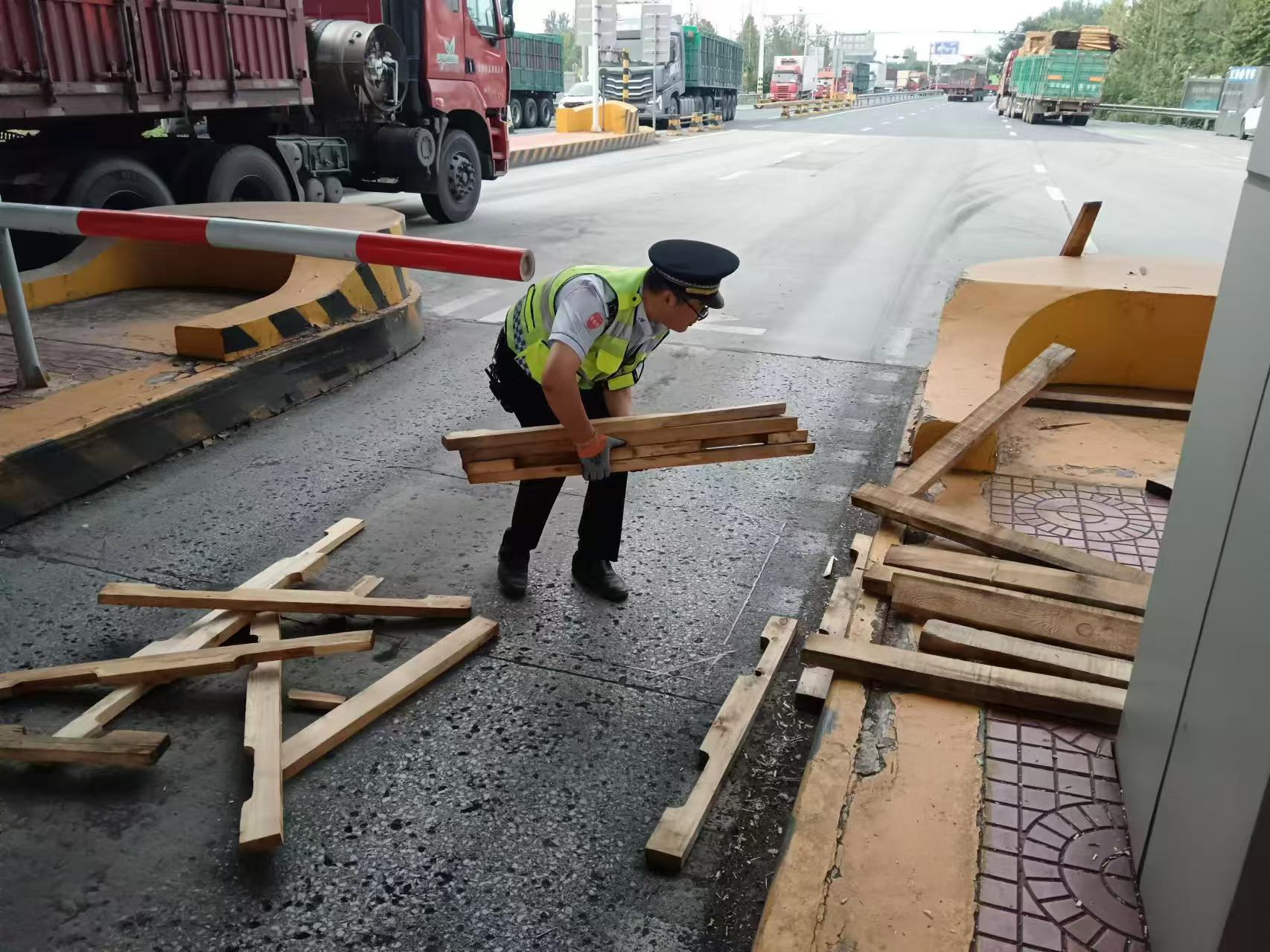 当日17时左右,一辆车牌号为冀A7J***的货车行至收费岛头减速带时,承载的木方随着车身颠簸晃动不断散落到车道内,而车主并未察觉,给后续车辆通行带来了极大的安全隐患。当班收费员周敏发现后立即上报班长,班长闫志科第一时间赶到现场,及时告知车主,并将后面其他车辆及时有序疏导到其他车道,有效避免二次事故发生。