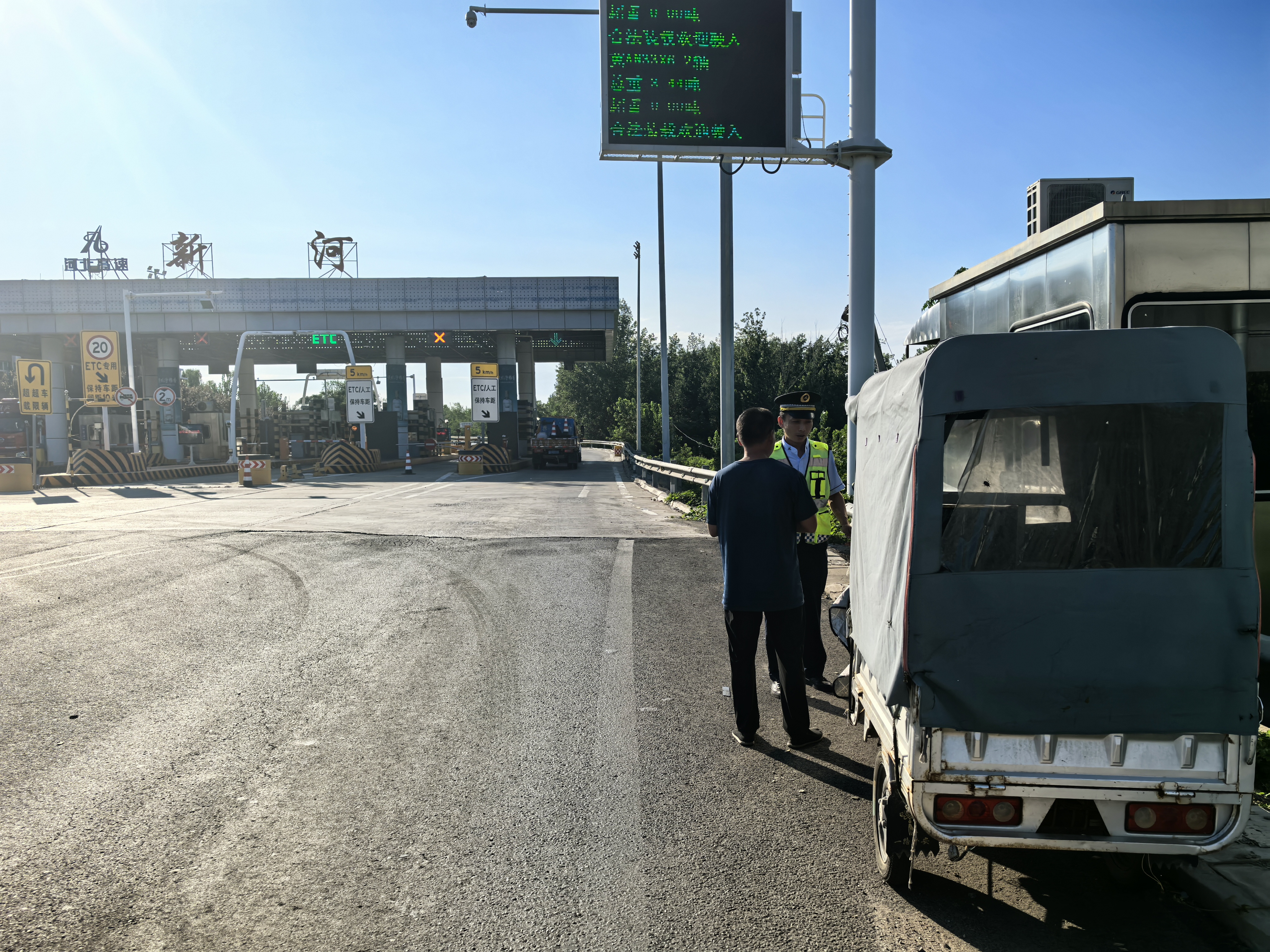 9月9日下午四时,新河收费站收费一班正在进行收费作业。入口计重岗亭值守人员发现有一位老人骑着电动三轮车驶向入口车道,过往车辆纷纷对其鸣笛避让,十分危险,便用对讲通知班长前来处理。