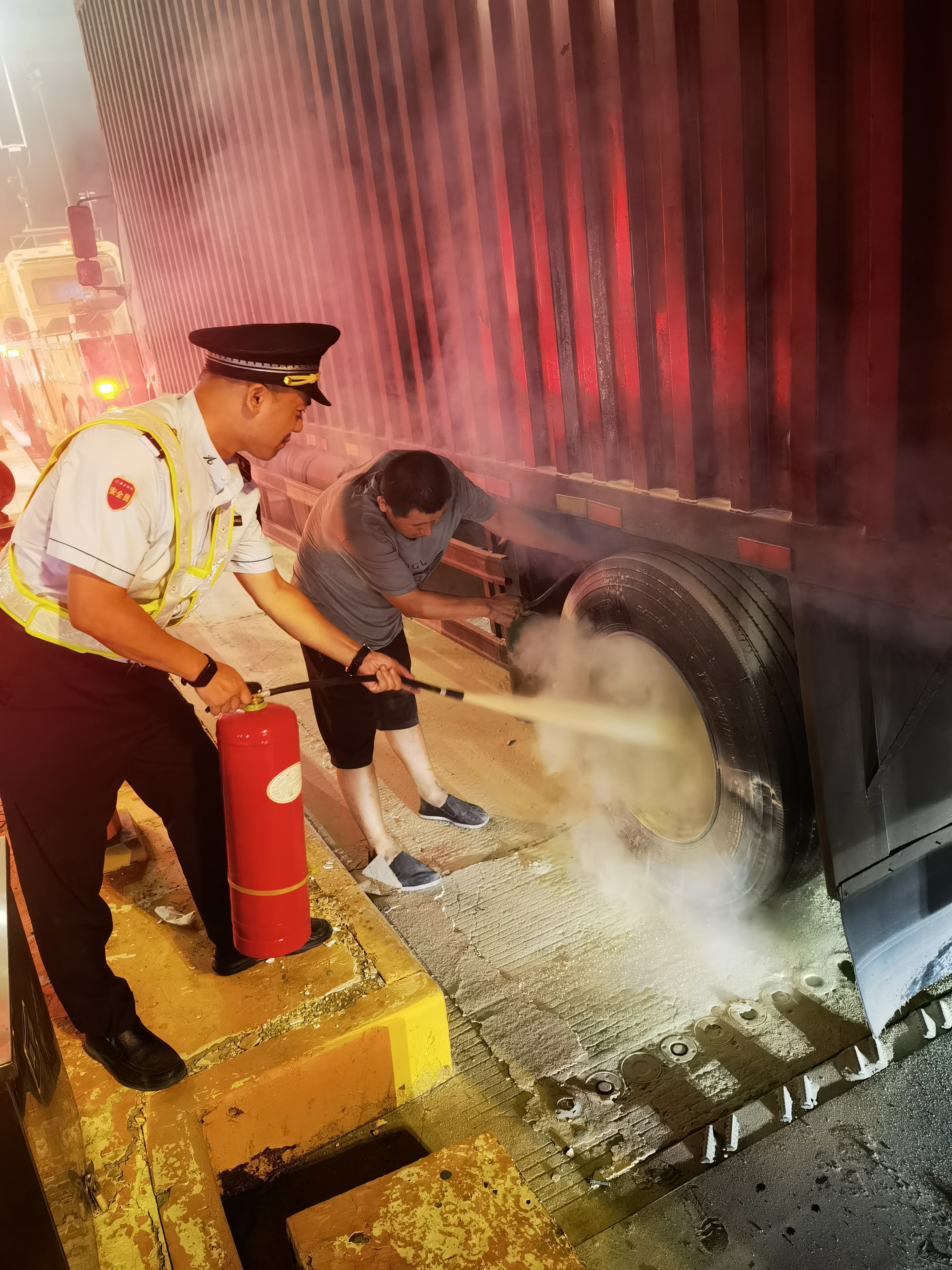 2024 年 9 月 16日22:15分,一辆六轴货车缓缓驶进赵县收费站,在车辆通过收费道口时,收费员发现该车的轮胎着冒着浓烟,还散发着焦味,凭借多年的工作经验,她立即用对讲机报告收费班长李朋朋:“班长,车道里这辆货车的轮胎着火了。”班长收到后,立刻和疏导员一起冲向收费四道,很快发现火源位置,并用灭火器成功将火苗扑灭。