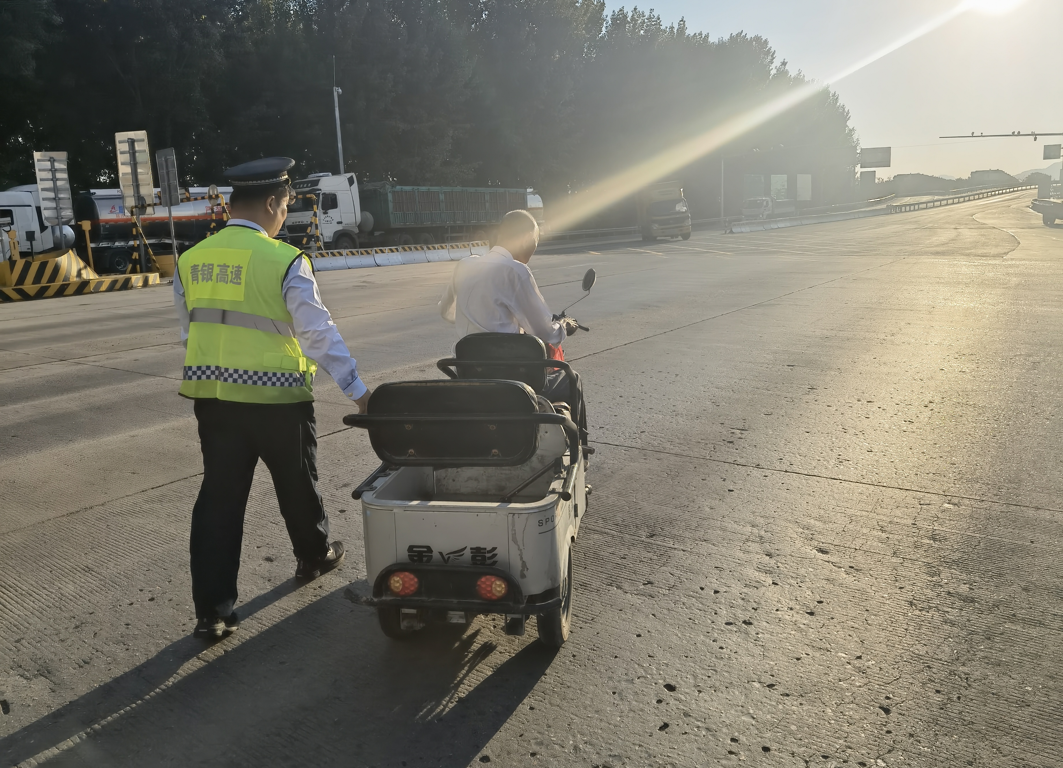 9月21日下午17点左右,窦妪收费站收费三班疏导员忙碌地疏导车辆,发现一位老人骑着电动三轮车,随着车流驶入车道。疏导员迅速上前拦截,示意老人靠边停车,将其带到收费站安全区域。