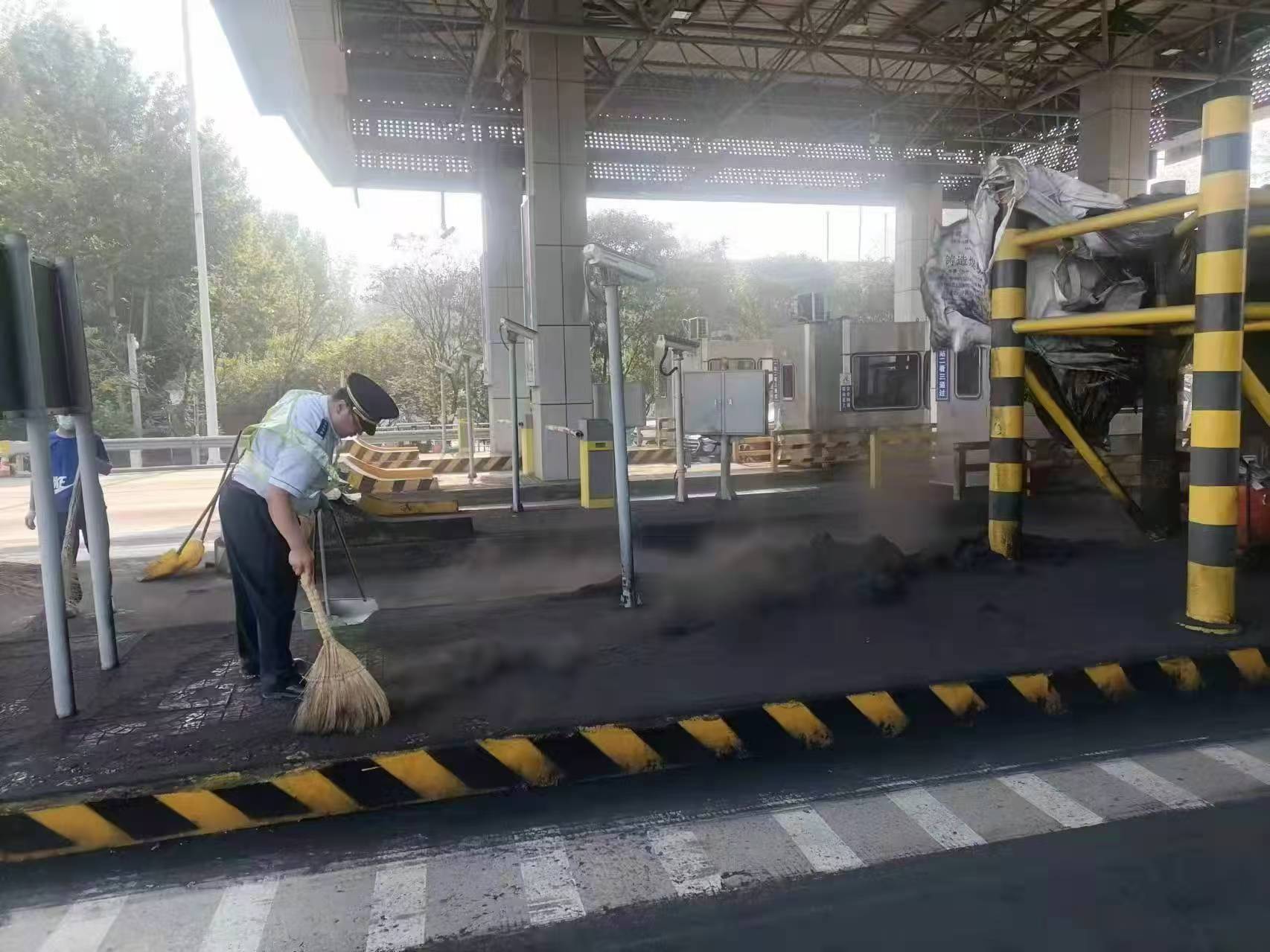2024年10月2日,国庆节小长假第二天,假期车辆临近峰值,栾城收费站收费三班正在紧张有序的进行收费作业。突然对讲机传出:“班长班长!101车道车辆剐蹭防撞柱,黑烟四起什么都看不清了。”闻讯值班站长和班长立即赶到现场,经查看一辆装载煤粉的重型货车在通过车道时由于经过长途跋涉货物装载发生倾斜,导致通过车道时与防撞柱发生剐蹭,其中四袋煤粉包装严重破损,黑色的煤粉撒落在车道内一瞬间黑雾弥漫,这突如其来的状况让司机不知所措。值班站长迅速发出指令:立即关闭101车道,在车道前方放置反光锥;疏导人员在101车道前方进行疏导,确保其他车辆有序通行;集合所有后勤值班人员穿好反光背心,多带两层口罩到车道进行货物收集工作。