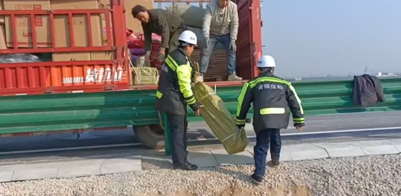 现场一辆六轴黄牌大货车发生单方事故,车辆撞破护栏板倾斜至边沟,车主称所装货物是价值200余万元的百货用品,所装载货物大面积洒落护栏板外,因车辆倾斜严重其他货品也随时有掉落摔坏的风险,车主十分焦急不知该怎么办。石家庄保通保畅应急大队首先摆放警示标志和反光锥,防止二次事故的发生,随后一边安抚焦虑的车主一边协助车主联系了4辆货拉拉车辆和搬运工20人转运货物,同时大队人员积极主动帮助搬运,经过四小时的不懈努力,所有掉落货物全部安全转运完毕。大队人员立刻又指挥救援公司的吊车和拖车开展救援工作,一小时后事故车辆拖离现场。车主激动地握着大队人员的手表示感谢,大队人员说这都是我们应该做的。
