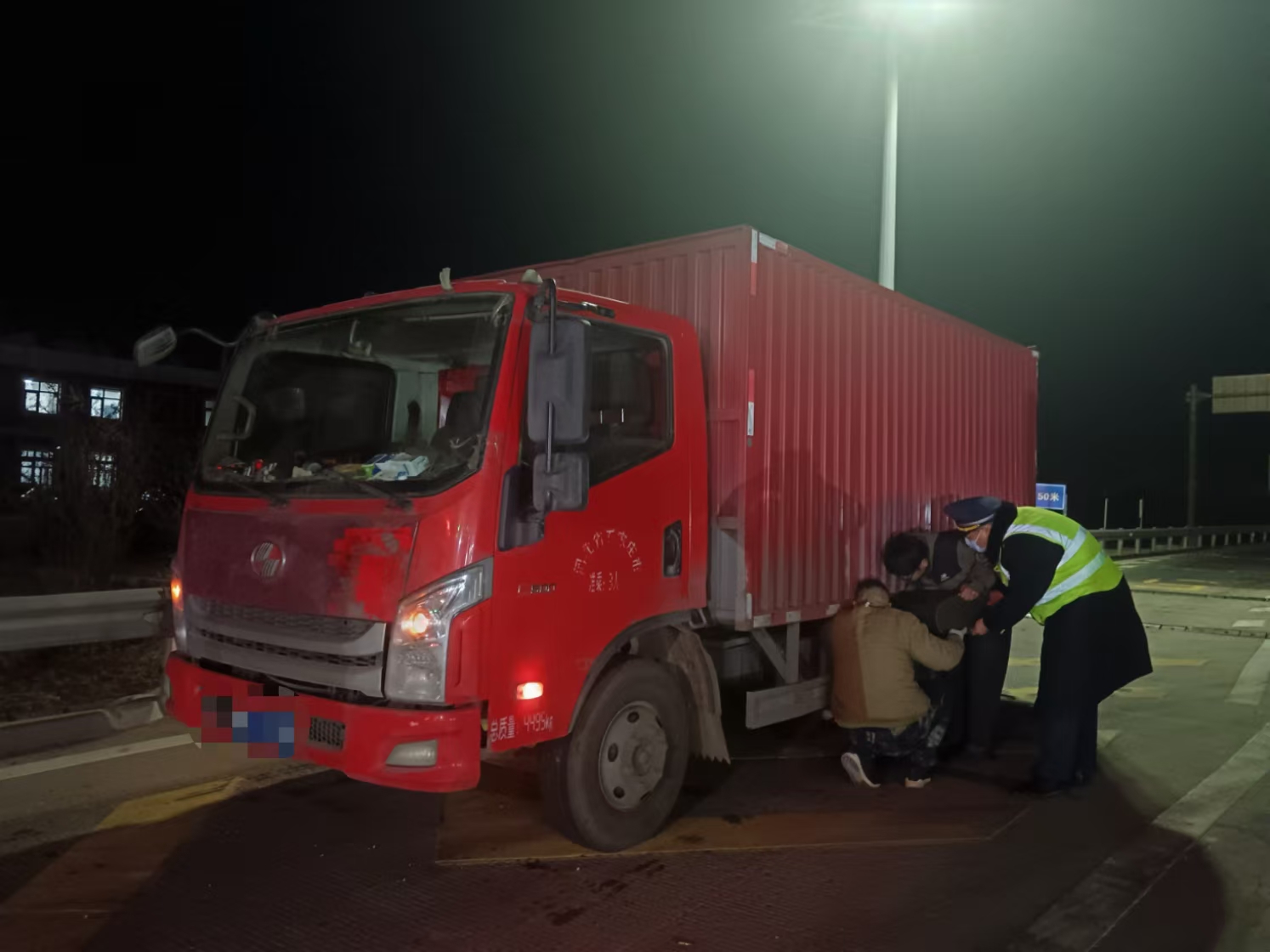 12月10日凌晨两点左右,一辆红色货车缓缓驶入铜冶收费站收费广场,停在车道前打着双闪,正值该岗亭收费的人员袁文俊发现后立刻报告班长。