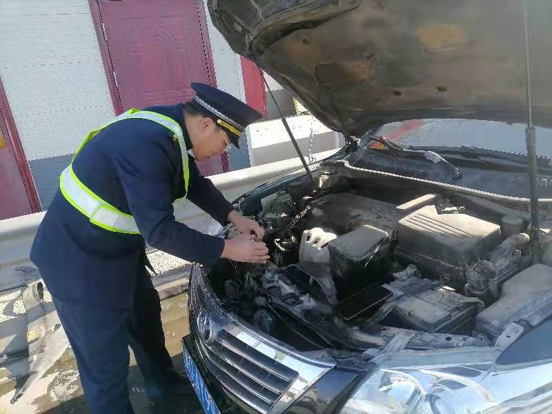 班长洒永民听到呼叫马上带领宁富明跑了上来,他们先引导司机把车开到下道广场的安全地带,然后叫司机师傅打开前机盖,一股热浪迎面袭来,宁富明一边安慰司机,一边拿水桶去打水,加完水后车辆温度慢慢下降,随后一起查看车辆故障,车辆风扇正常运转,但是有个地方轻微的漏防冻液。司机师傅非常着急,洒班长安慰司机师傅:“您的车肯定以前就有轻微的漏水,只是你没有发现,我们给您加满水,确保您能开到家,然后您到家里把水放完,防止冻坏车辆,过了年马上去修理就行了。”司机师傅露出了欣慰的笑容并表示感谢说:“今天遇见你们真是帮了我大忙了,要不大过年的,我都不知道怎么办。”洒班长说“不用客气,这都是我们应该做的,路上注意观察,祝您春节愉快。”司机上车,启动车辆,脸上露出来了满意的笑容,挥手驶离了收费站。