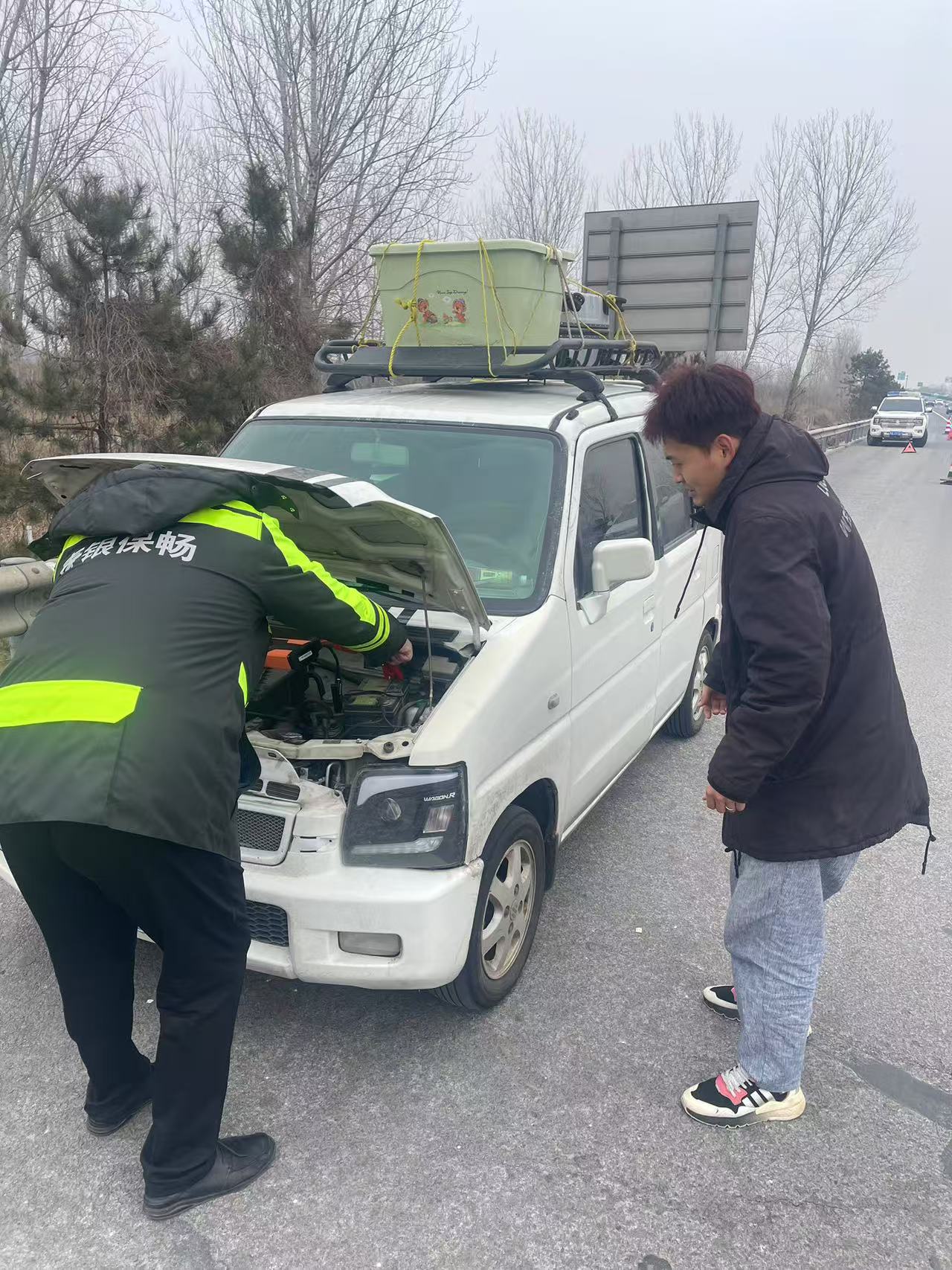 1月31日下午3点30分许,石家庄保通保畅大队在日常巡查中发现一辆一型客车停靠在应急车道,经询问得知该车因亏电无法启动,大队队员立刻从巡查车取出随车配备的搭电线,很快故障车成功启动,司机感激万分。