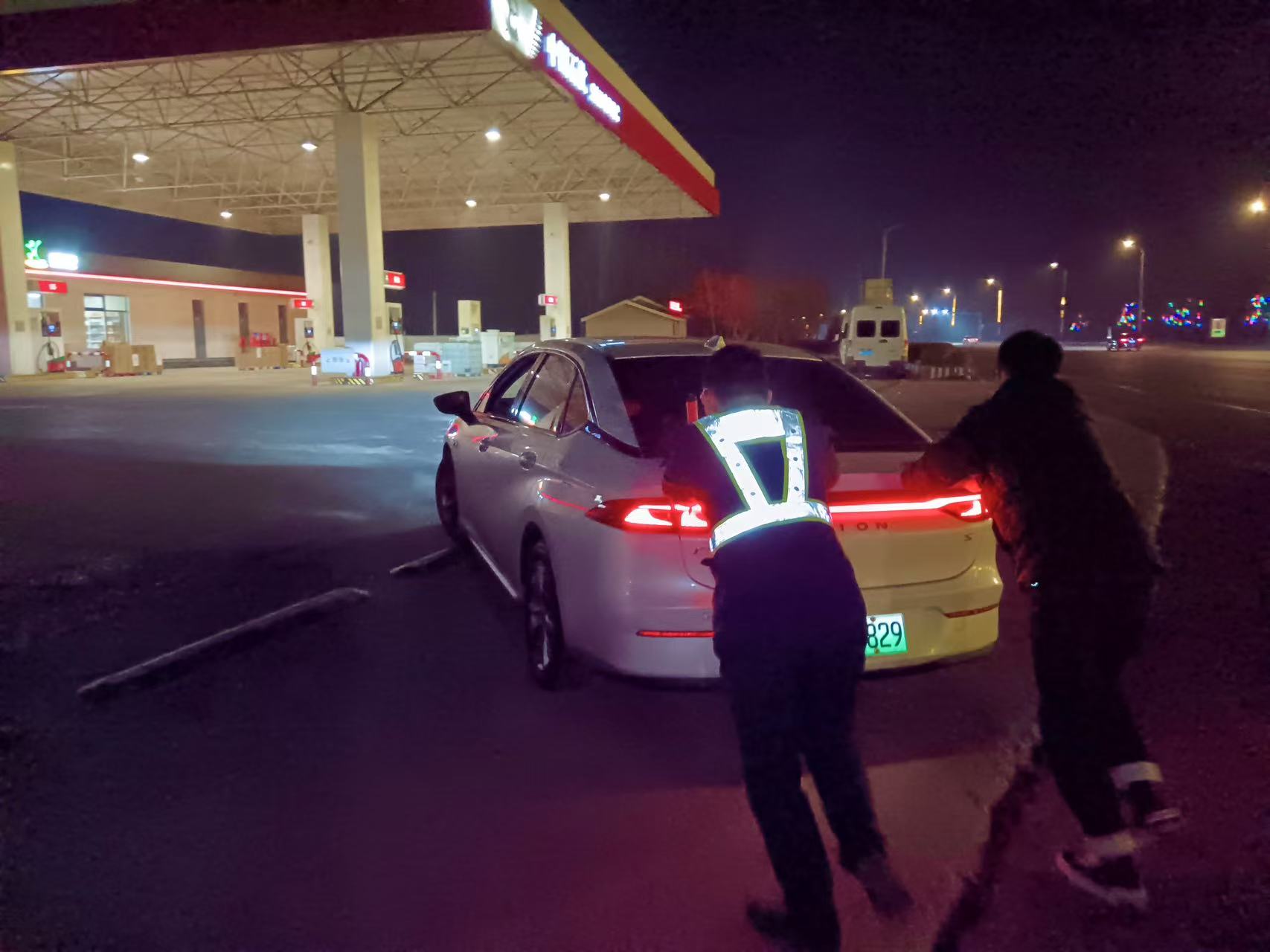 经到现场询问得知,这辆轿车为纯电动汽车,司机刘先生一家三口驾车从济南到石家庄游玩,由于自己粗心大意,忘记给车辆充足电,在行驶至距离南宫站匝道出口一公里处因电量耗尽无法前行,他便安排妻子在车上掌握方向,自己在后方推车从南宫站下道充电后再赶路。虽然是小轿车,但由于深夜天气较冷,刘先生一人推车仍有些吃力,速度较慢,且有一定的安全隐患。张亚涛见状连忙和张龙分工合作,一人在车辆后方用指挥棒预警引导后方来车注意避让,一人帮助刘先生推车,先后交替作业,帮助刘先生推行约1.2公里,到达站口充电站成功充电。刘先生为张亚涛和张龙的热心帮助伸手点赞,并一个劲儿地说:“真是太感谢两位同志了,大过年的,给你们添麻烦了。”张亚涛和张龙齐声回复说:“不客气,这是我们应该做的,下次您出门一定要注意先检查下车辆情况,以避免出现不必要的麻烦,祝您全家新春快乐,出行平安!”张亚涛还向刘先生宣传了高速公路上出现车辆故障时的正确处理方式,确保安全出行,刘先生对张亚涛的提醒也连连点头,表示赞同和认可。