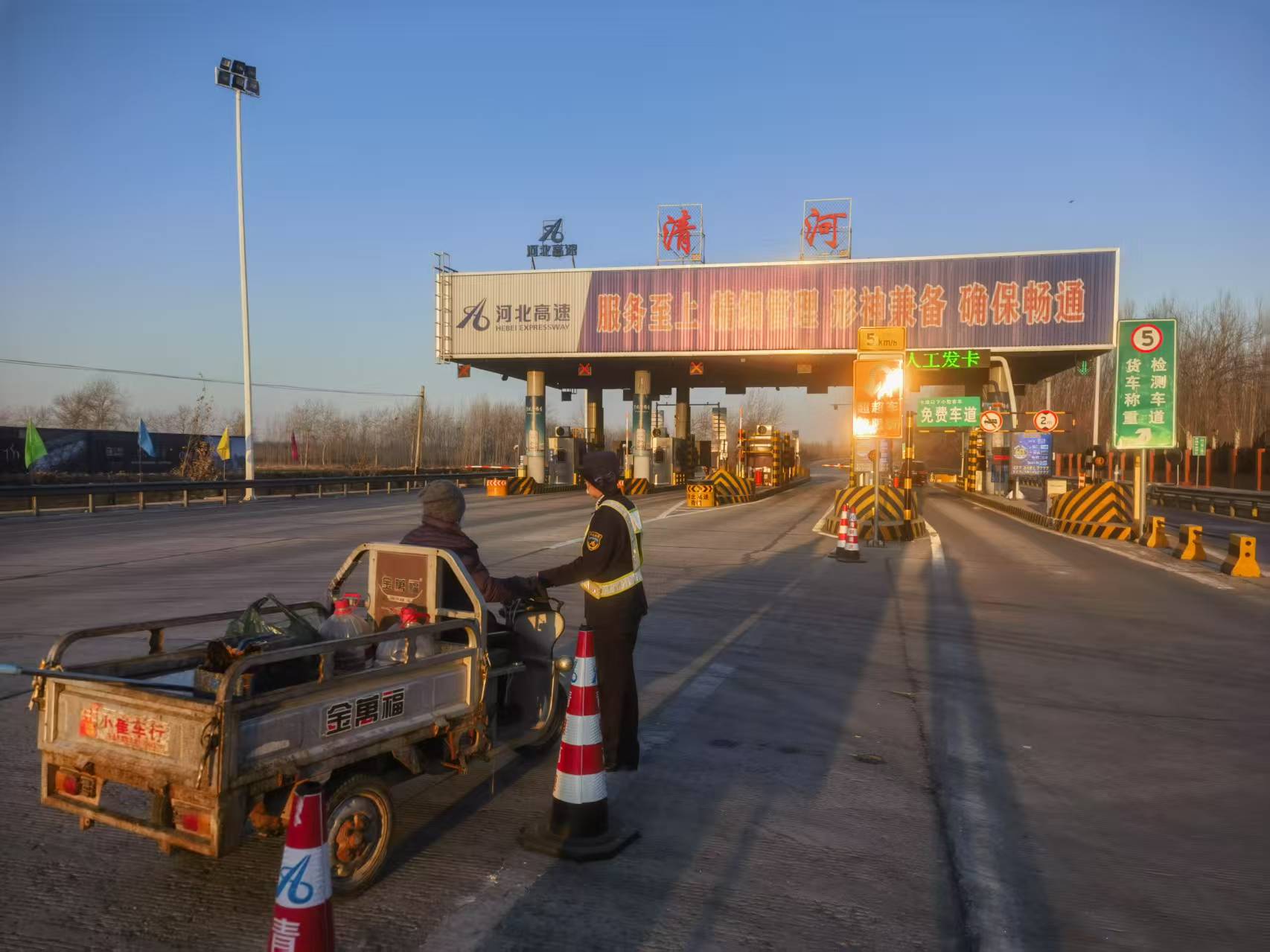 2月4日,正值春节返程高峰的最后一天。清晨,清河收费站收费二班在岗,突然,对讲机里传来发卡员何璐急切的呼喊:“班长!一辆三轮车上高速路了!”当班班长耿云磊听到呼叫,迅速冲出岗亭。只见一辆三轮车正晃晃悠悠地朝着收费广场驶来,周围车辆疾驰而过,情况十分危急。耿云磊一边挥舞手臂,示意大爷停车,一边大声呼喊,竭尽全力引起大爷的注意。在他的努力下,三轮车终于缓缓停下。