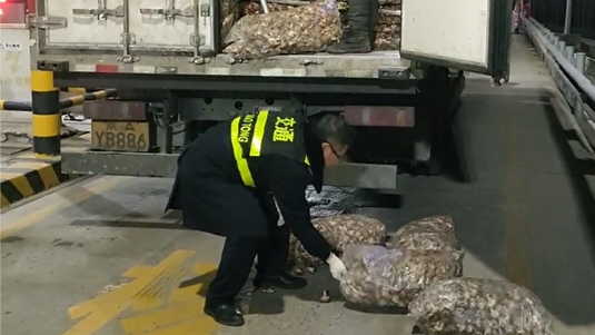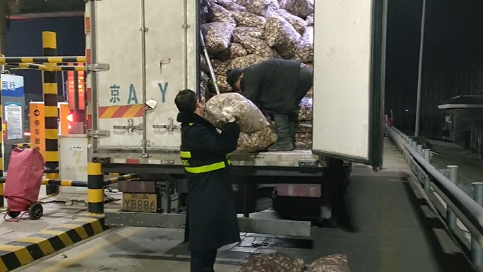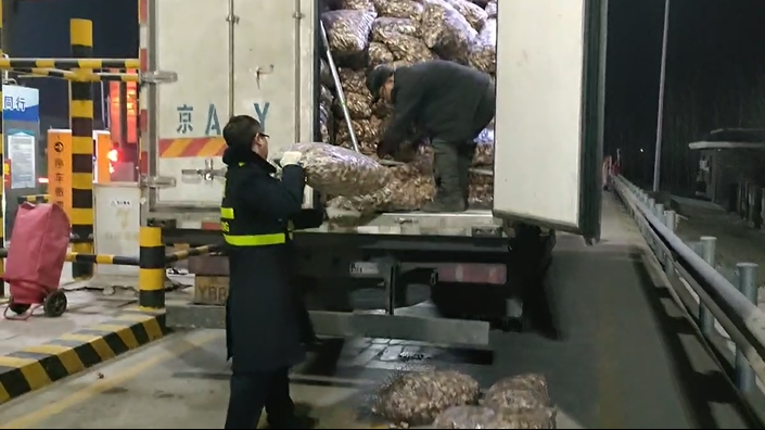 2月19日凌晨,平安城收费站当班班长与收费人员按照流程对一辆绿通车开展查验工作。
