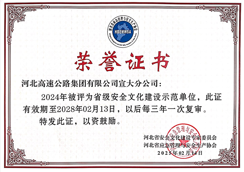 2024年11月,宣大分公司向省应急管理与安全生产协会申报了省级安全文化建设示范单位,并接受了张家口市和河北省两级考核组现场评审。2025年2月14日,顺利通过评审,荣获省级安全文化建设示范单位。