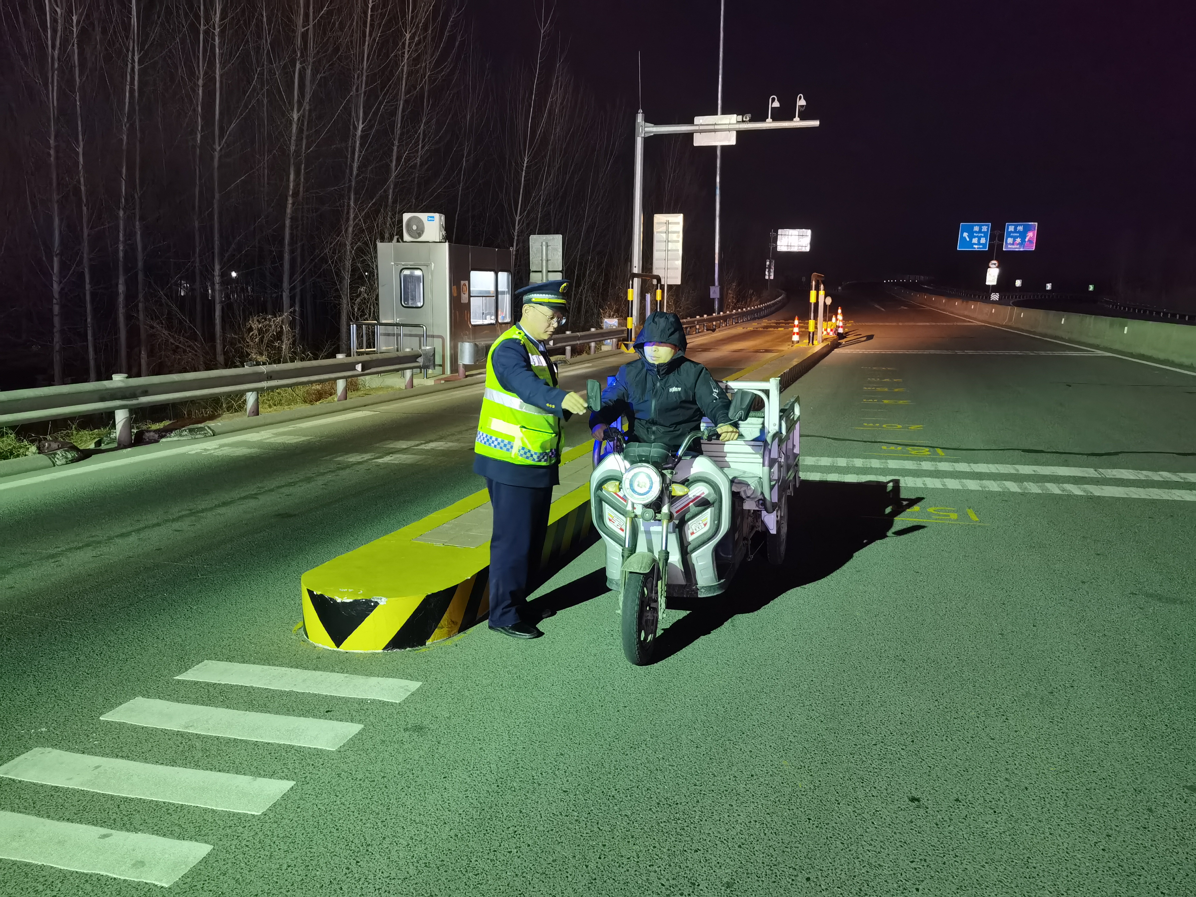 3月10日20时许,一辆电动三轮车误入冀州南收费站治超车道,值守治超岗亭的收费员发现后立即拦停车辆,并通知当班班长。