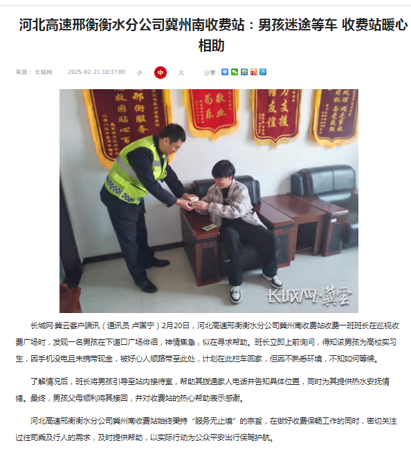 河北高速邢衡衡水分公司冀州南收费站:男孩迷途等车 收费站暖心相助