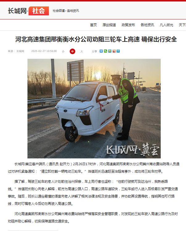河北高速集团邢衡衡水分公司劝阻三轮车上高速 确保出行安全