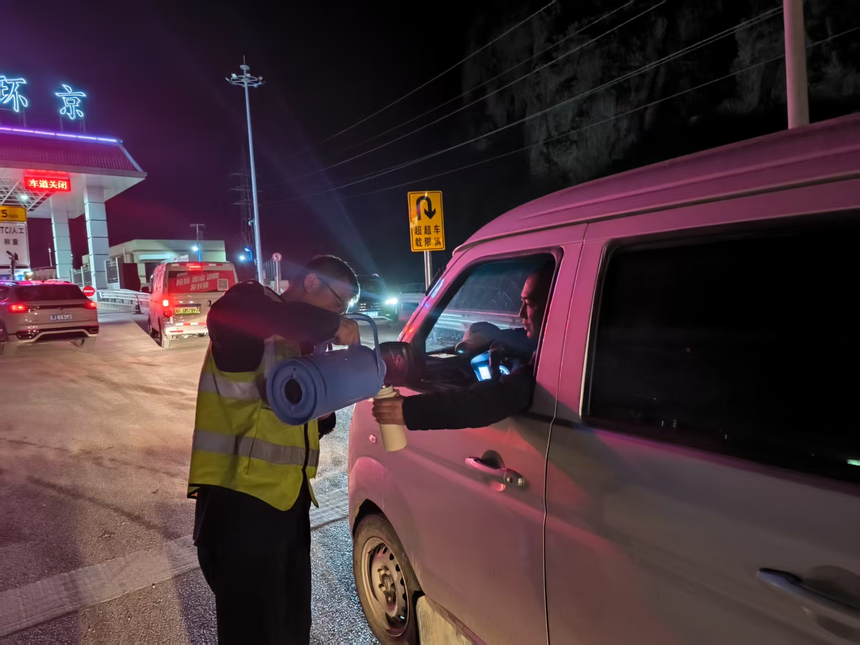 为安抚司乘人员情绪,工作人员主动为司乘提供了热水和方便面等食品。面对司乘人员的路线咨询,工作人员借助地图和手机导航,为司机规划绕行路线,确保他们能够顺利找到替代路线继续行程。