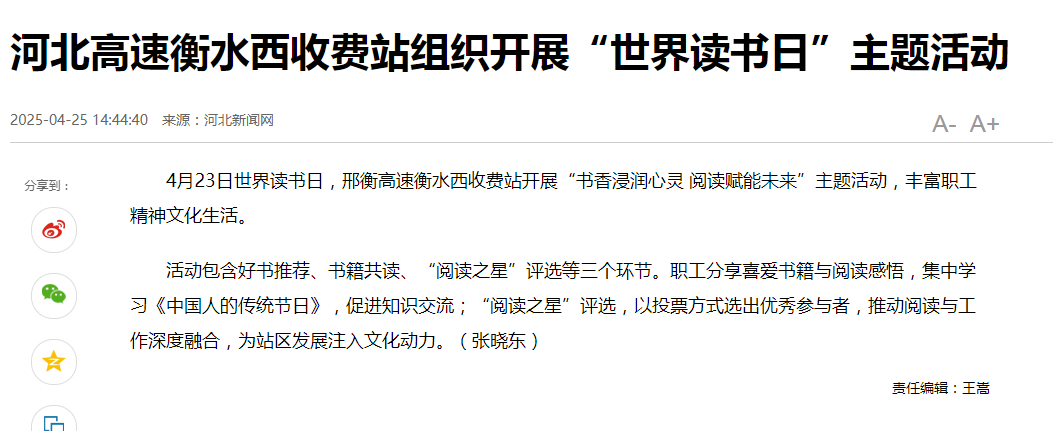河北高速衡水西收费站组织开展“世界读书日”主题活动