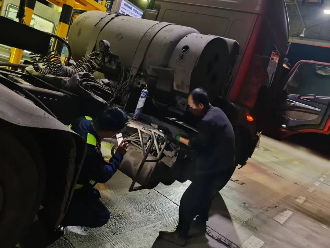 班长第一时间冲向故障车,手持手电俯身照亮故障点,精准定位制动故障部件,同时将扳手递至司机手中;疏导员立即在后方安防警示标志,引导车流有序绕行,同步向排队司机解释情况、安抚情绪。春夜的凉风里,三人的身影在车灯与手电光束中来回奔走,组成最动人的“守护矩阵”。
