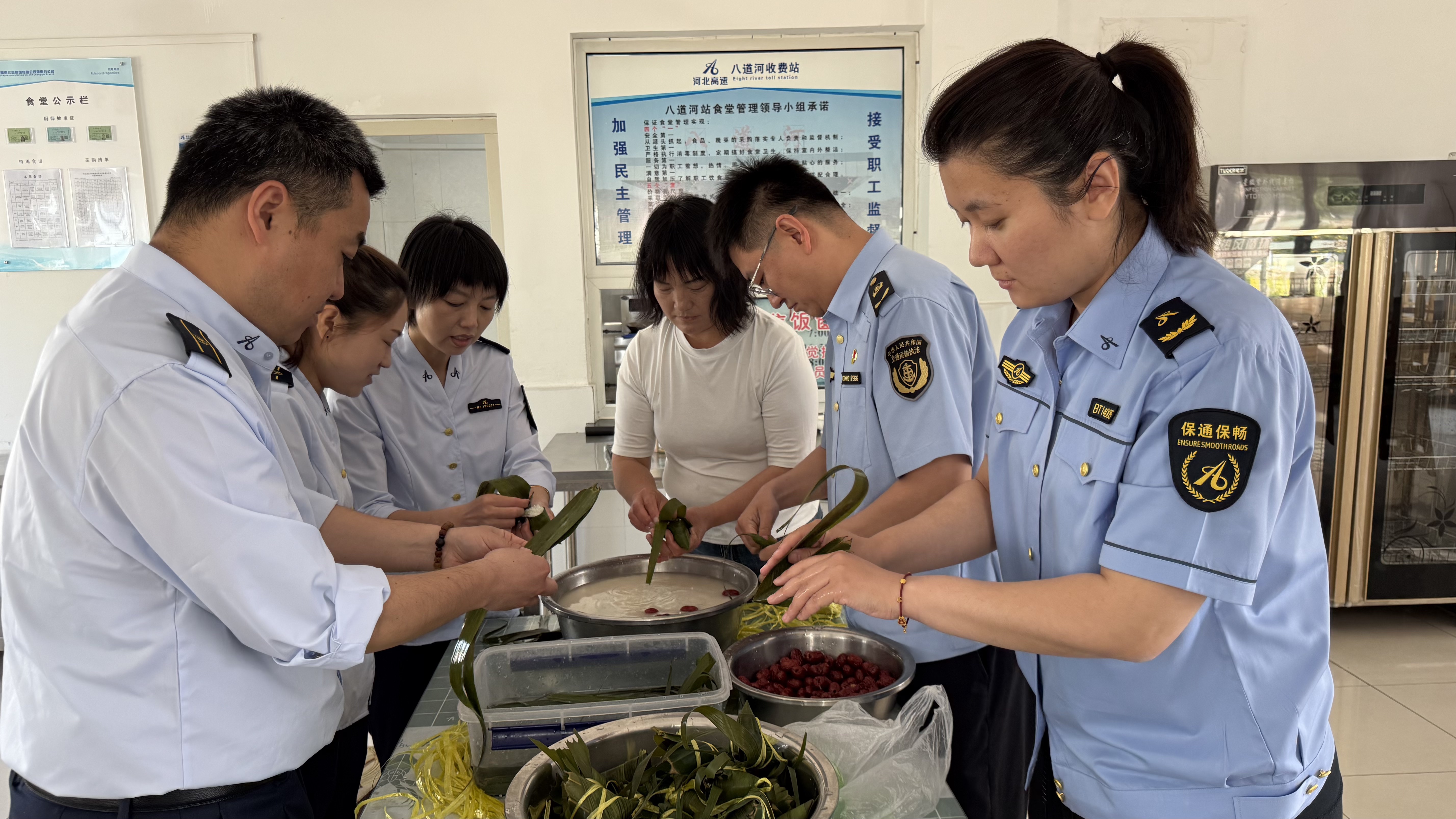 为弘扬中华民族传统文化节日,丰富职工精神文化生活,打造温馨站区,营造积极向上、健康和谐的工作生活氛围,5月26日,八道河收费站联合八道河应急大队、青龙路政大队、八道河隧道管理站,在食堂开展“粽香凝心迎端午,联建共融促发展”活动,以传统文化习俗为纽带增进区域协作单位情谊。