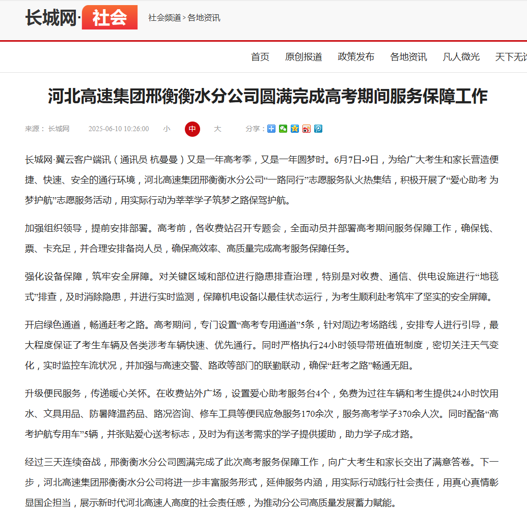 河北高速集团邢衡衡水分公司圆满完成高考期间服务保障工作
