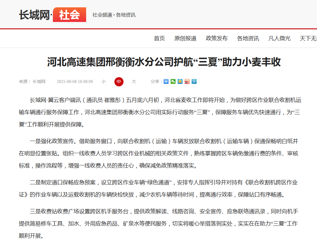 河北高速集团邢衡衡水分公司护航“三夏”助力小麦丰收