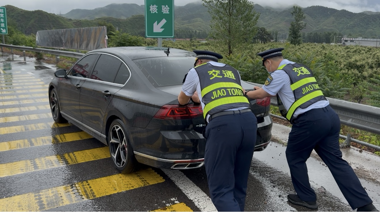 当班班长发现异常情况后,立即带领疏导员到故障车位置,了解情况后,“师傅别急,我们帮您推车!”班长一边安抚司机,一边与疏导员冒雨奋力推车,合力将故障车辆推行至安全区域,随后又协助司机联系了维修人员。