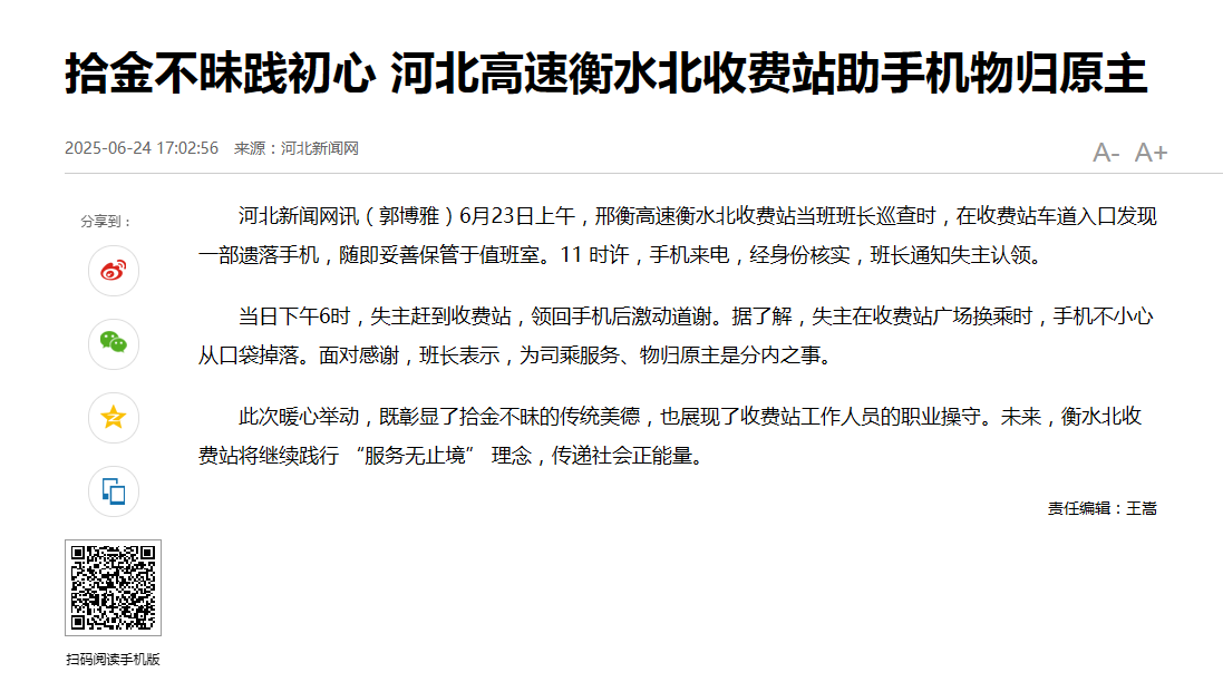 拾金不昧践初心 河北高速衡水北收费站助手机物归原主