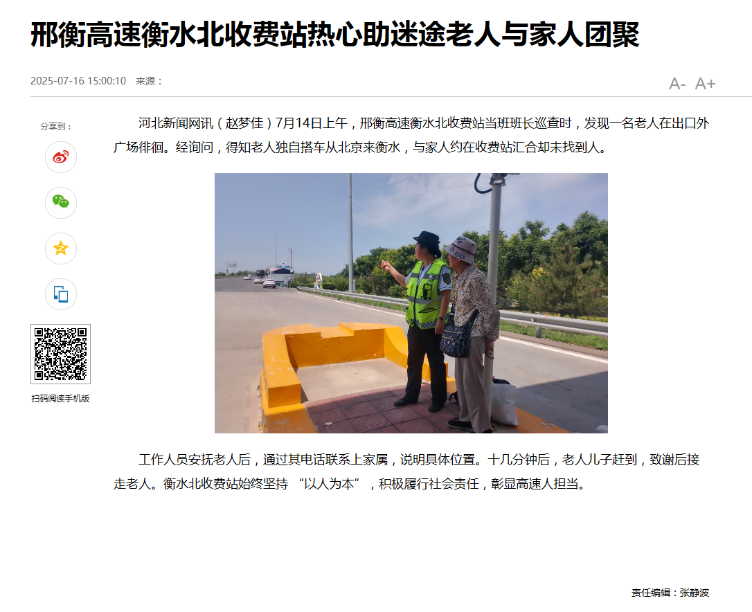 邢衡高速衡水北收费站热心助迷途老人与家人团聚