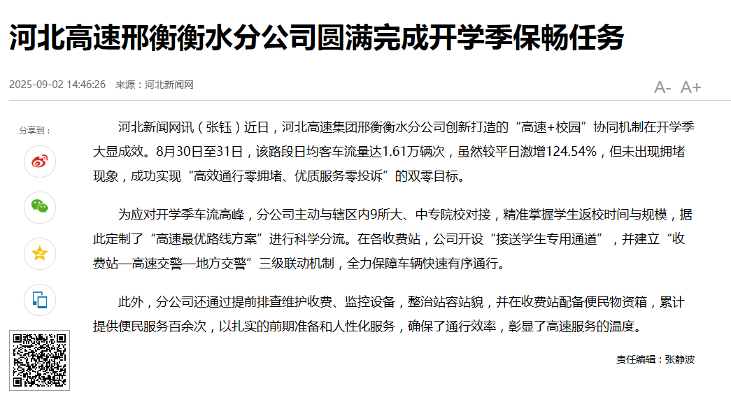 河北高速邢衡衡水分公司圆满完成开学季保畅任务