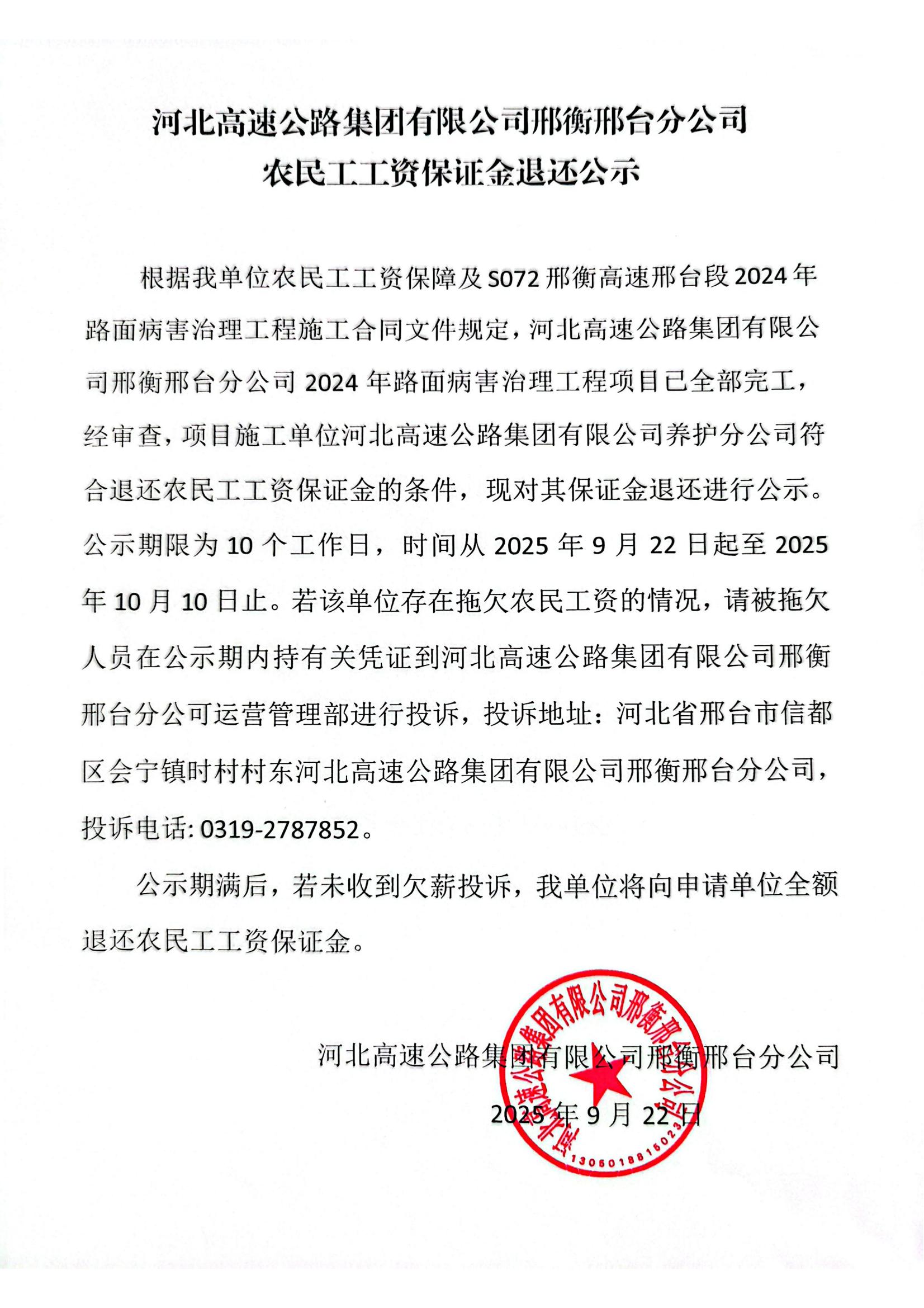 邢衡邢台分公司农民工工资保证金退还公示(2024年路面病害治理工程)