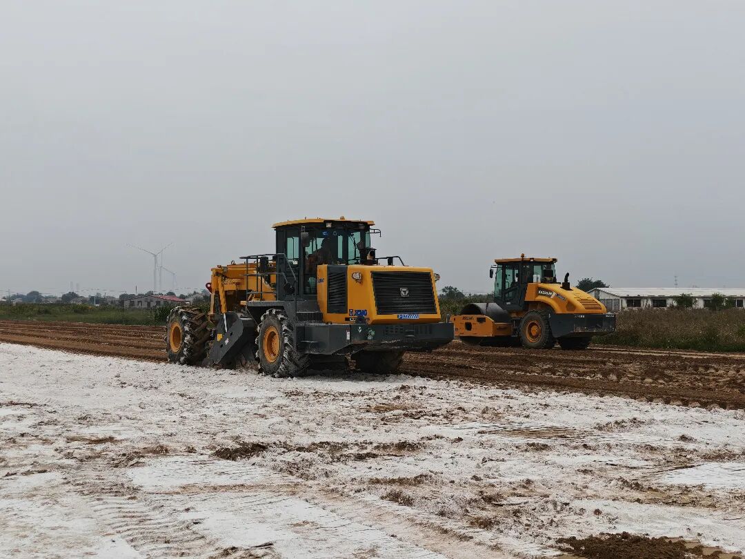 路基之旁,碾压车辆的往复轰鸣:在路基填筑区,巨大的振动压路机和轮胎压路机正在司机的精准操控下,进行着有序的碾压作业。它们来回穿梭,发出沉重的轰鸣,将新填筑的土石料一层层压实、碾平。施工人员紧跟其后,进行压实度检测,确保每一寸路基都坚实可靠,足以承载未来川流不息的车流。