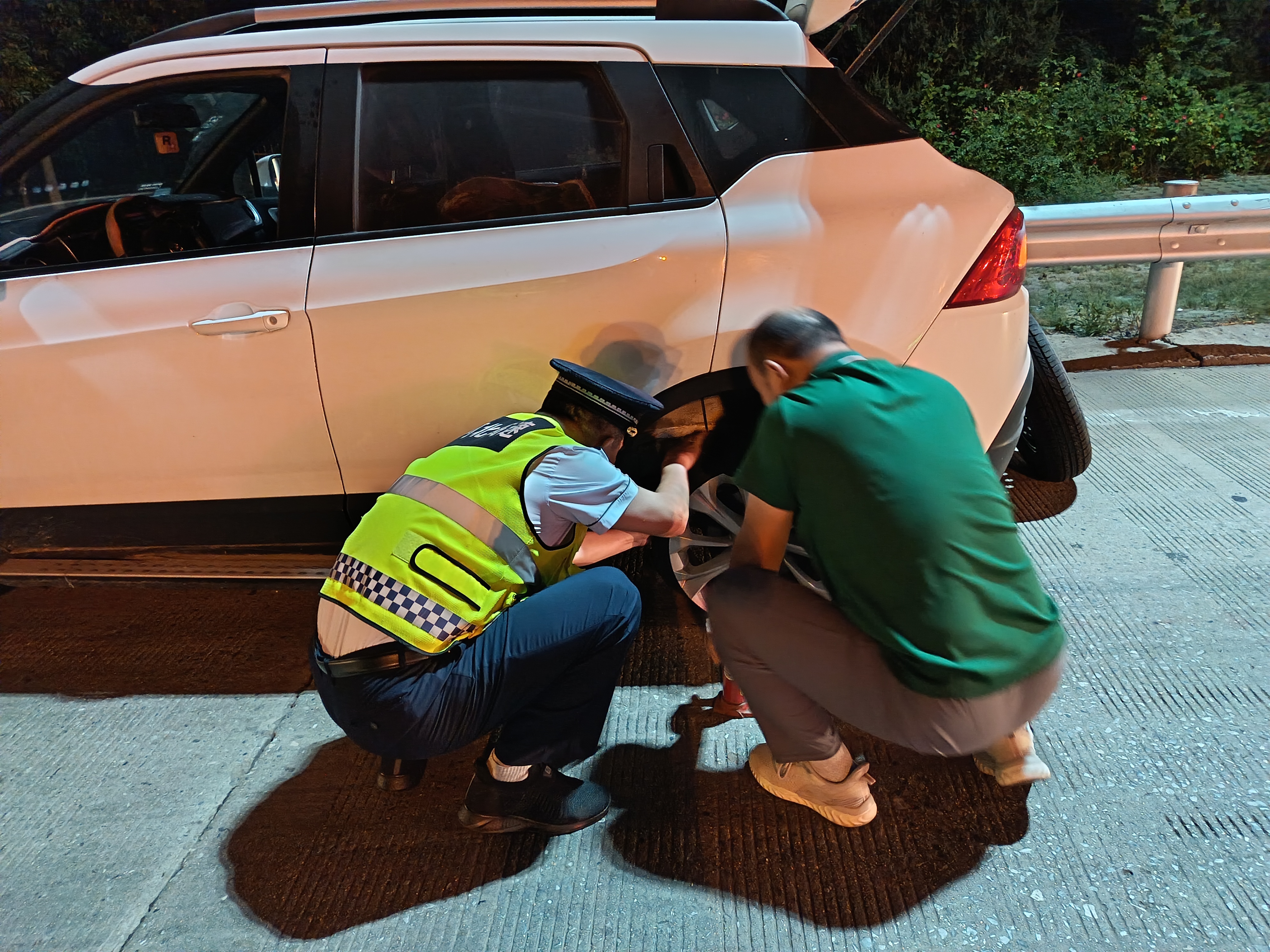 中秋当晚七点左右,在京沪分公司青县收费站外广场,一辆白色轿车打着双闪驶出收费车道后靠边停下,当班班长张玉松看到后立刻快步上前查看情况。