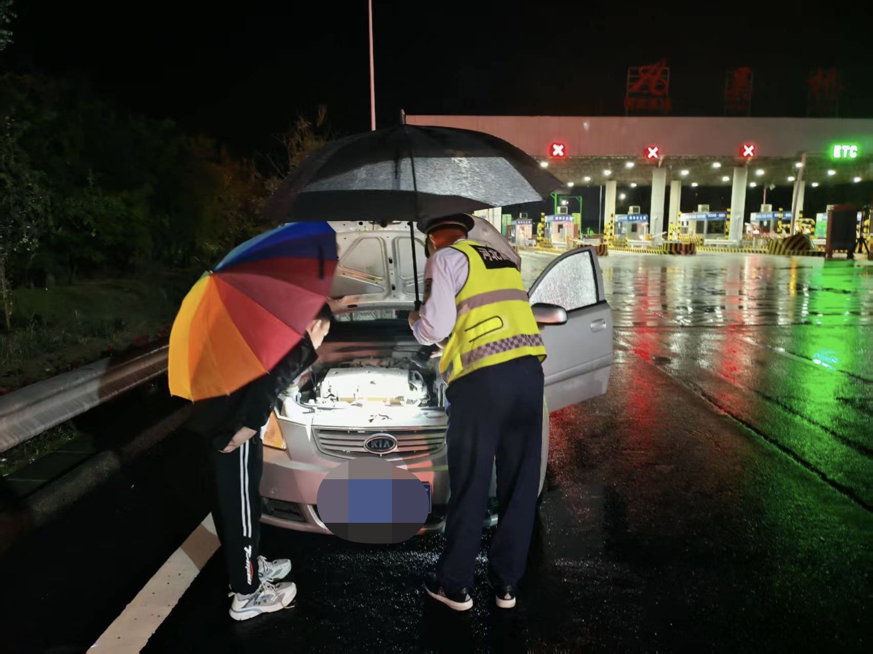 当班班长杨炳松发现这一险情后迅速响应,第一时间携带爆闪灯、探照灯等设备,冒雨赶赴故障车现场并帮忙检查故障车辆。经与司机反复“诊断”,初步确定电瓶亏电造成故障。