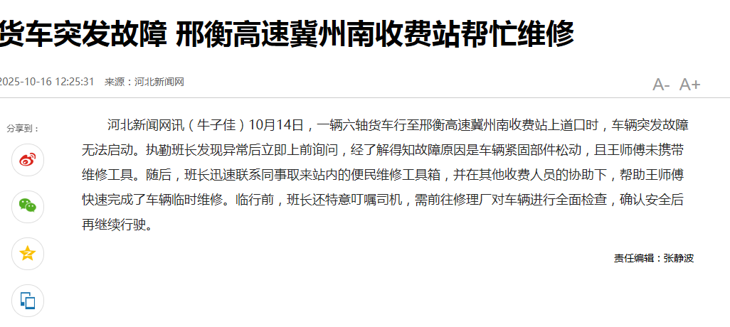 货车突发故障 邢衡高速冀州南收费站帮忙维修