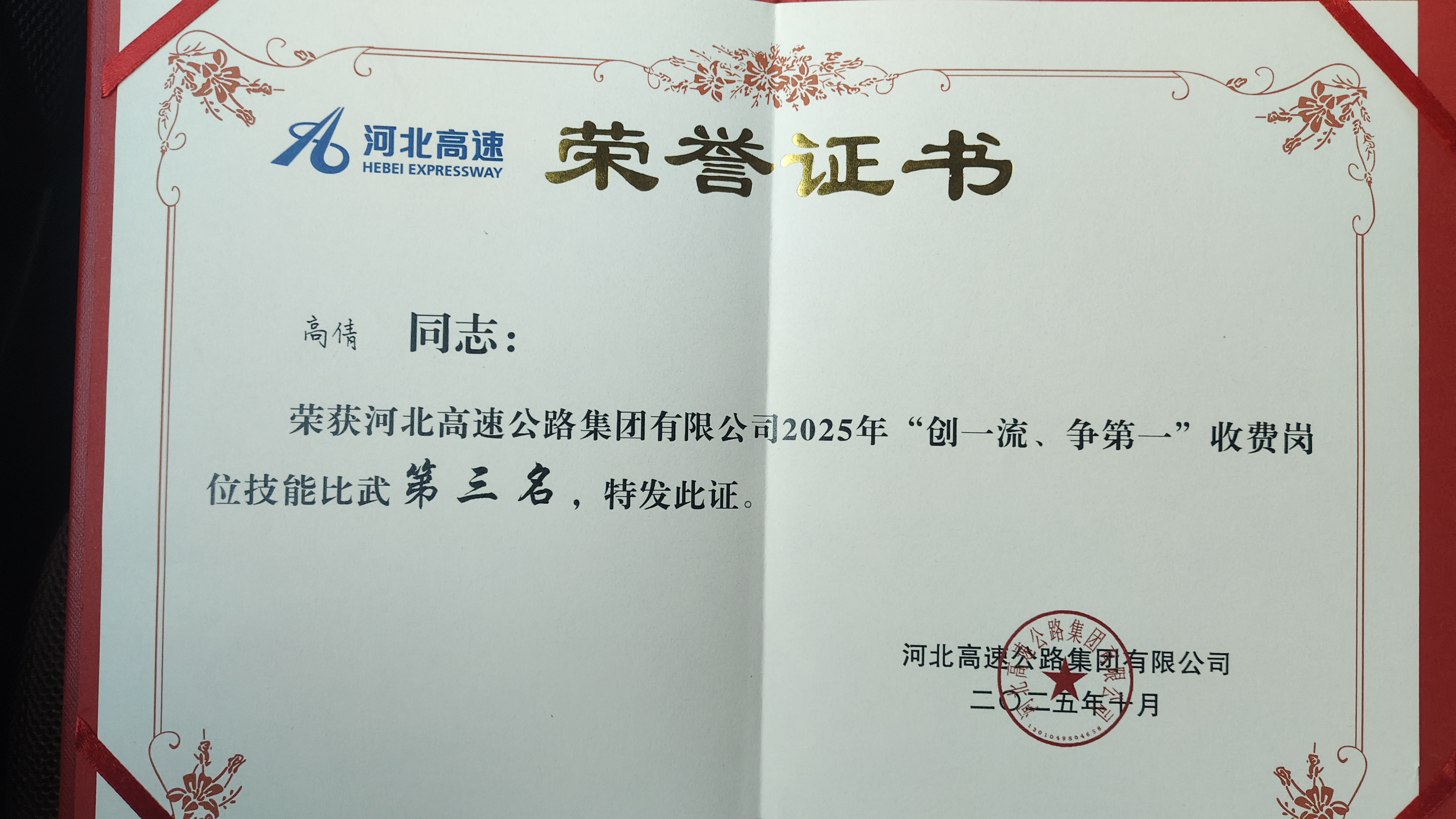 10月29日,集团公司2025年“创一流 、争第一”收费岗位技能比武总决赛圆满落幕,京哈北线分公司荣获集团公司2025年“创一流、争第一”收费岗位技能比武总成绩第三名,参赛选手高倩凭借扎实的知识储备、敏捷的应变能力,荣获总决赛个人成绩第三名的优异成绩,充分展现了我单位职工精湛的业务技能和昂扬的精神风貌,为京哈北线分公司赢得了荣誉。
