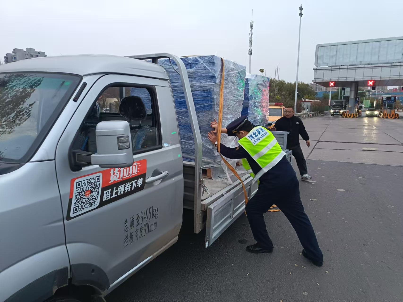 近日,在京沪分公司青县收费站一辆蓝牌货车缓缓驶入发卡车道,当班收费员许欣明像往常一样递出通行卡时,突然发现该车车后装载的货物发生了明显的倾斜,随时有散落的危险。