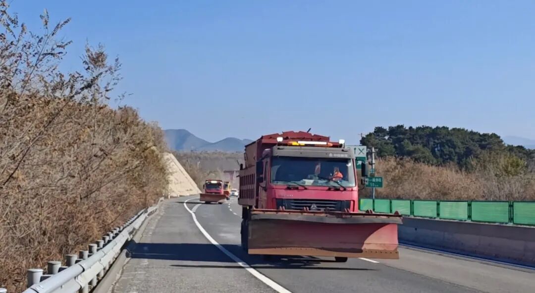 安全保障组立即布设安全警示标志,交通疏导组联合遵化、玉田交警大队及遵化路政大队人员实施交通管制。随后,1号除雪撒布车严格按照“30克/平方米撒布剂量、12米撒布宽度”的作业标准开展融雪剂撒布,指挥车全程监测撒布质量与覆盖效果。撒布作业完成后,3台除雪车按“1号—2号—3号”顺序依次开展铲雪作业,雪铲交错间距控制在30至50厘米,并保持安全车距,高效完成除雪任务。最后,巡查检查组对现场除雪效果进行验收评估,确认作业质量符合预设标准。