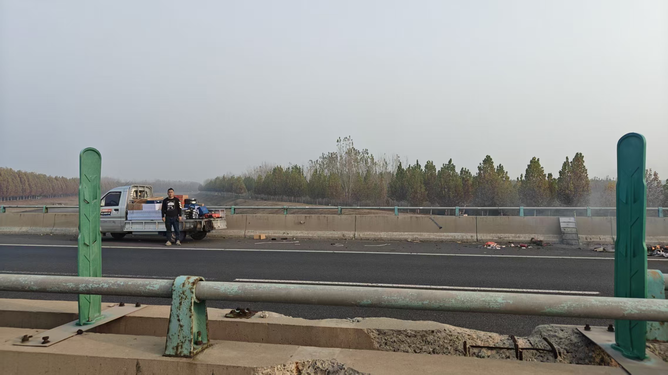 事发当时,一辆拉载胶皮手套、透明胶带、木板等易燃物的货车停靠在应急车道,车辆尾部起火燃烧。司机的灭火器已经用尽,但火焰仍在蔓延。