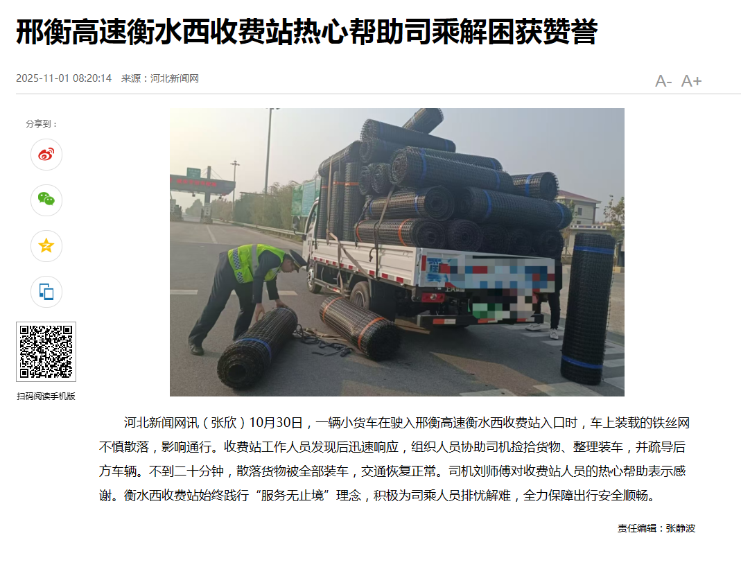 邢衡高速衡水西收费站热心帮助司乘解困获赞誉