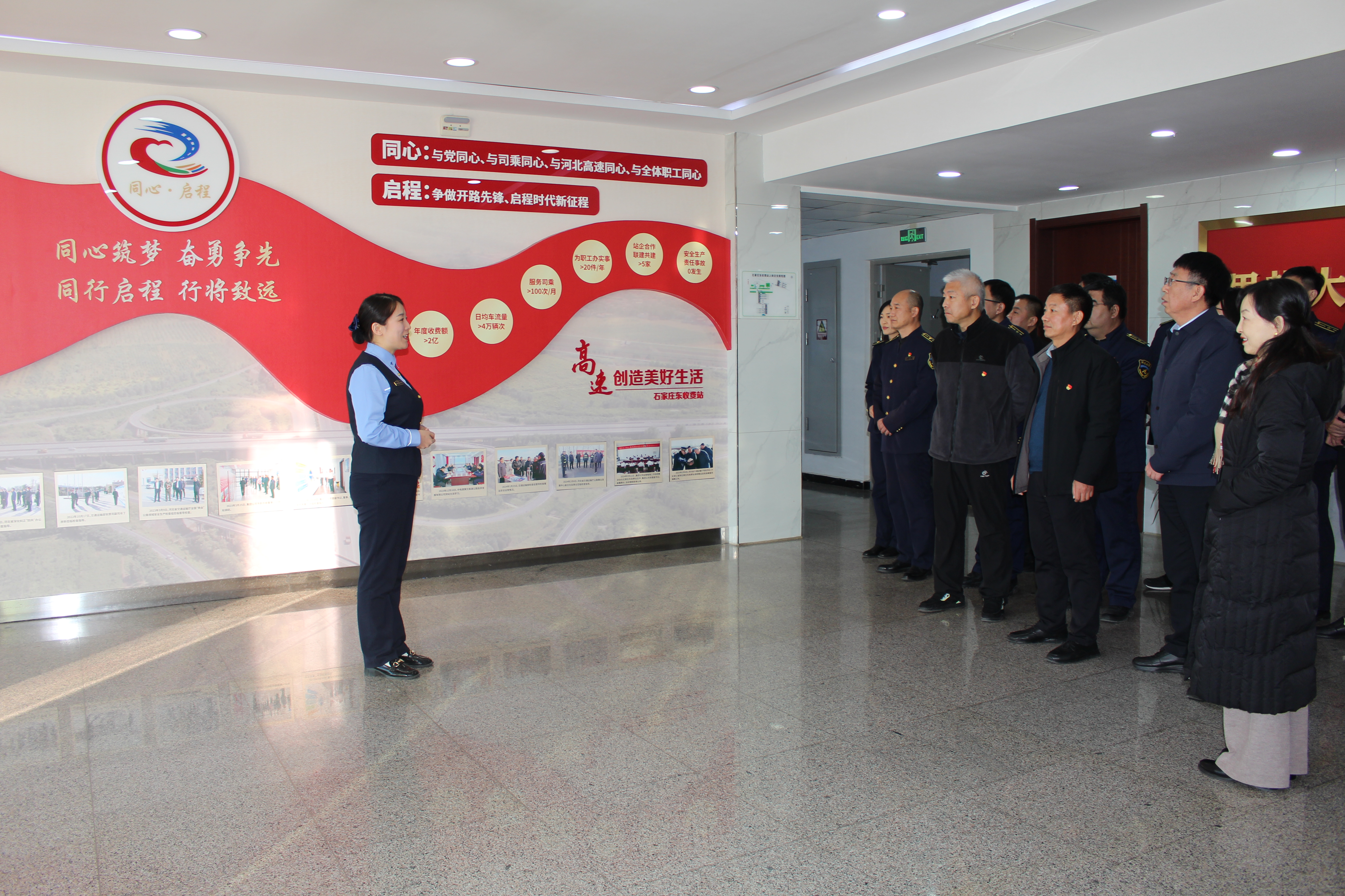 翟忠伟一行实地参观了“同心·启程”党建品牌主题墙、同行文化墙、六大工程墙和安全文化墙等党建文化阵地,通过现场观摩与详细讲解,深入了解石家庄东收费站在党建品牌创建、文化阵地建设及特色党建活动开展等方面的创新做法和实际成效。