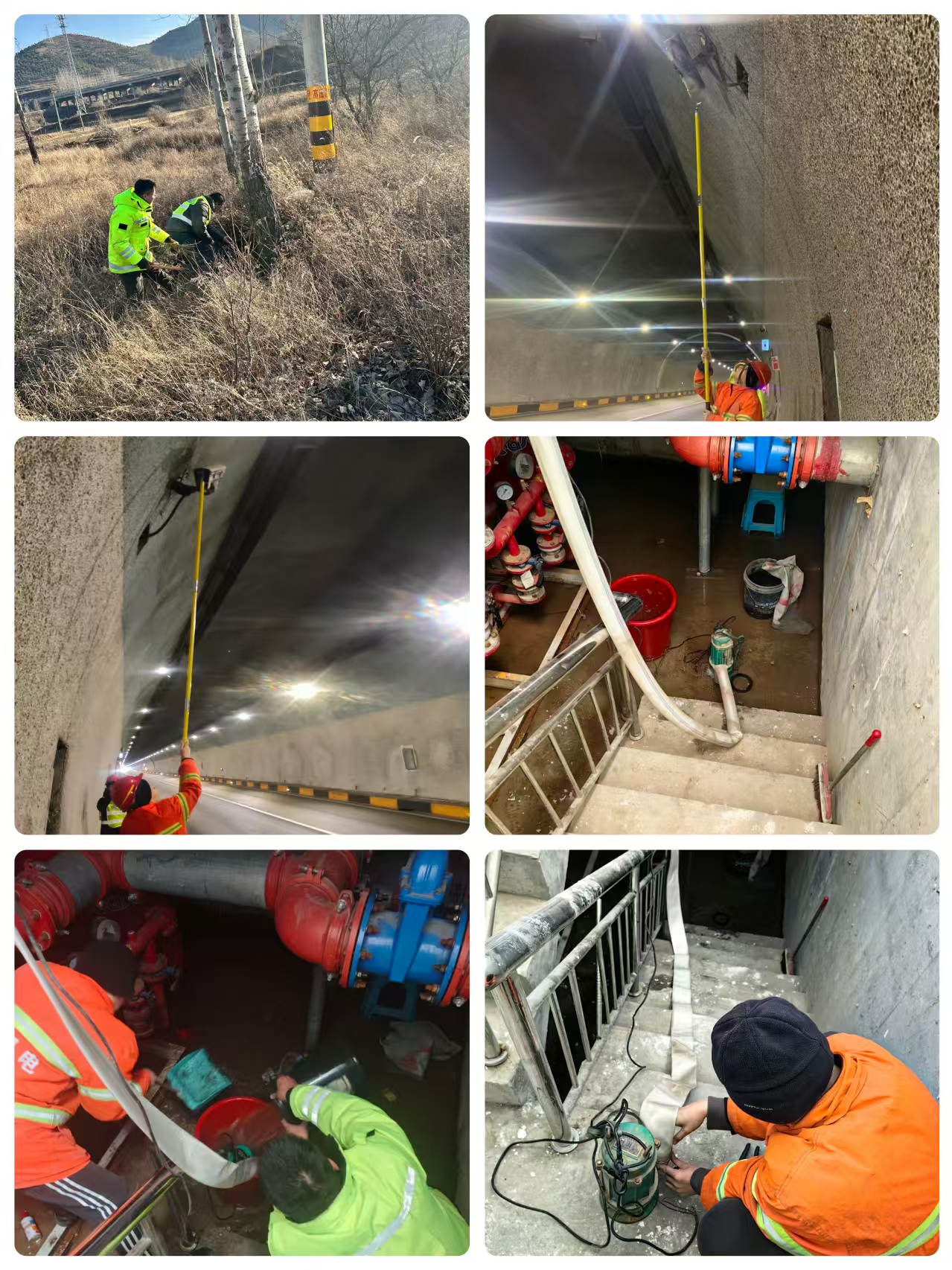 在高压线路保障环节,机电人员对515、516线路沿线杂草实施全面清理——通过“人工修剪+集中清运”的方式,彻底消除植被倒伏可能引发的线路火灾安全隐患;针对营尔岭水泵房积水情况,机电人员溯源排查问题成因,以疏通排水管道、检修防水设施等措施根治积水隐患,同步对泵房设备及环境开展清洁工作,确保设施运行环境安全整洁;为提升隧道监控效能,机电人员逐台校准驿马岭隧道内的监控摄像机,优化镜头角度与覆盖范围,实现隧道全域无死角高清监控,为各类应急处置工作提供可靠技术支撑。