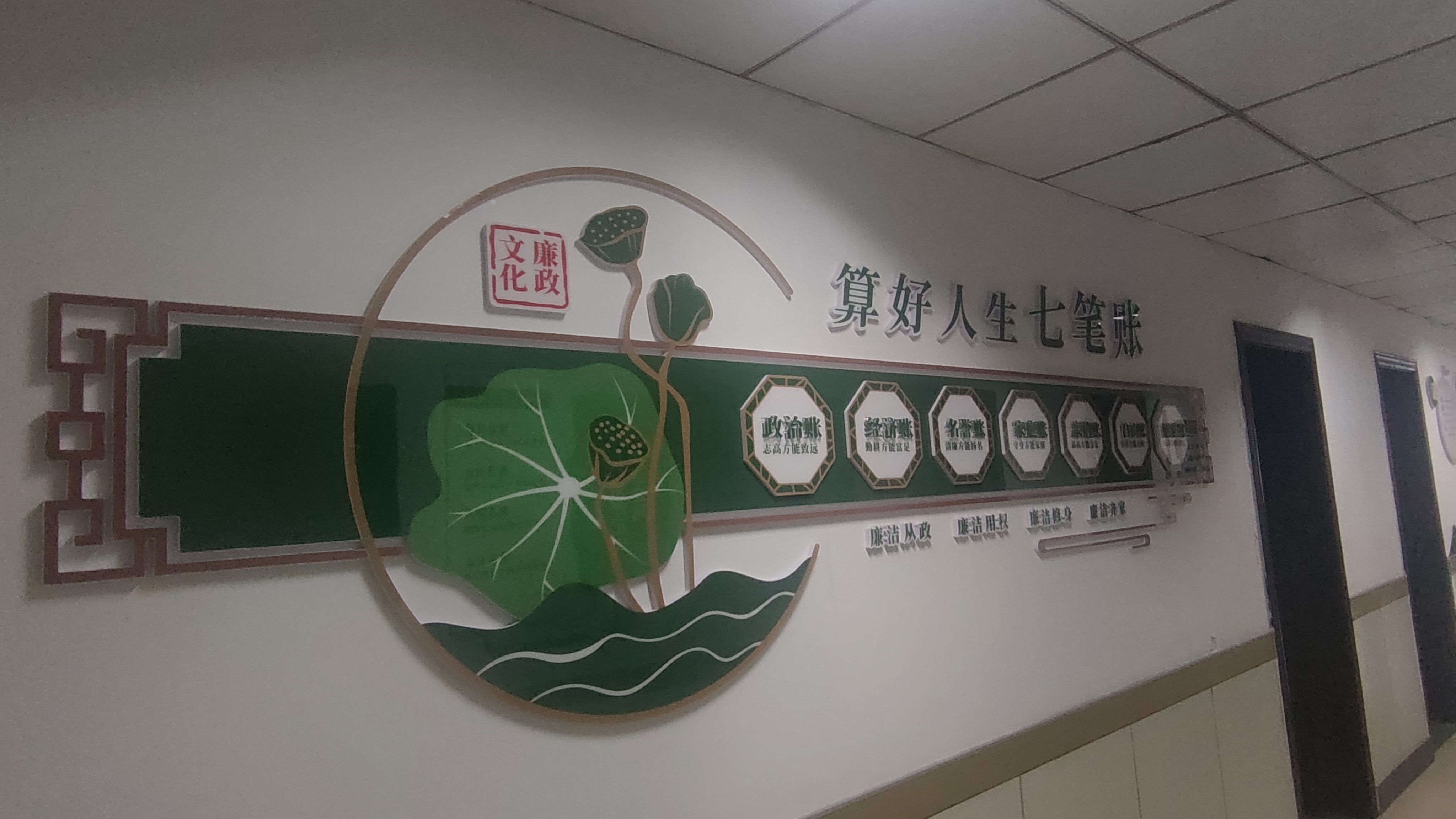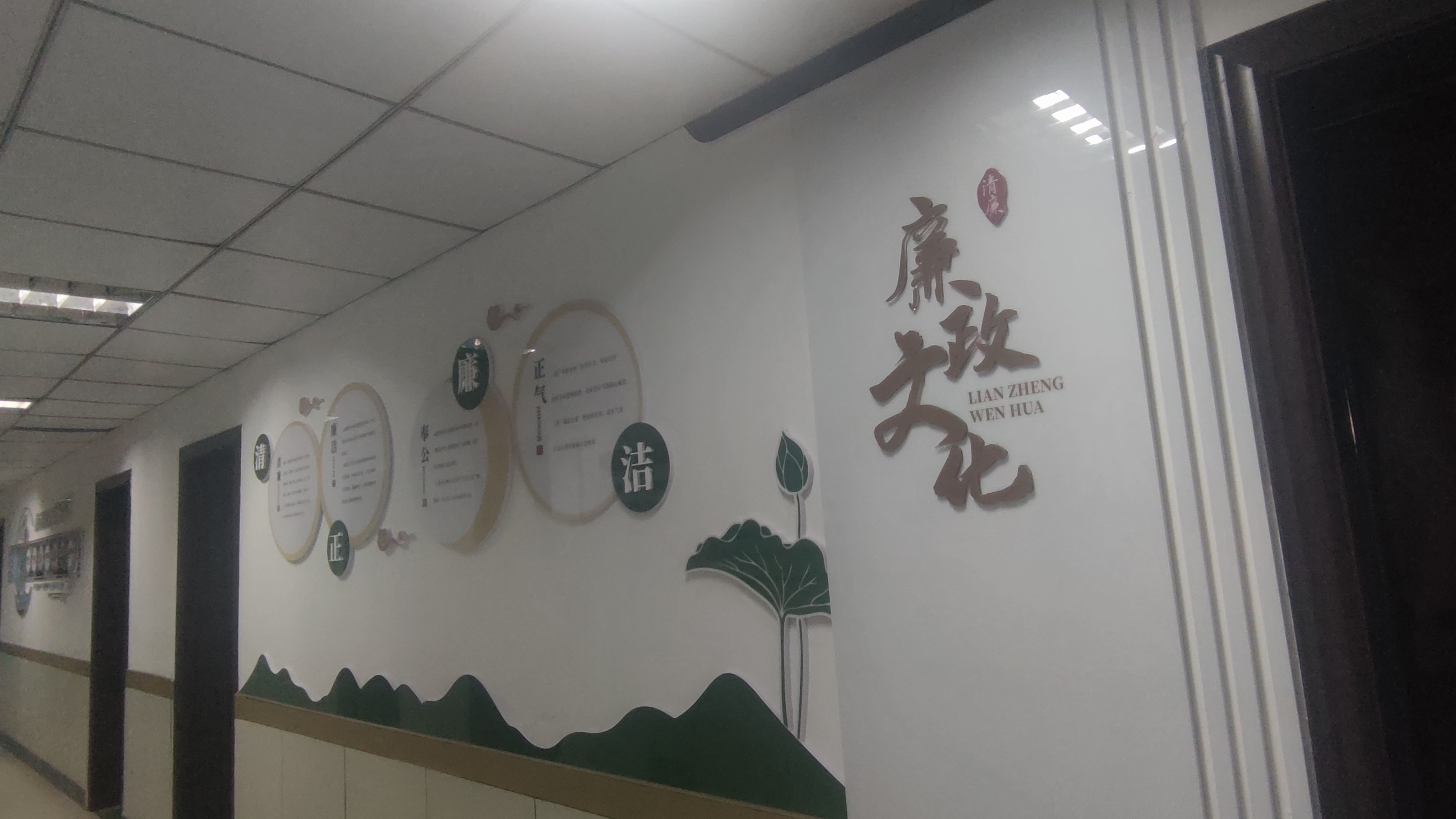 廉洁文化长廊依托大队办公区域走廊空间打造。以“廉”为核心,以“文化浸润、警示教育、价值引领”为设计理念,整体设计以绿色为主色调,搭配莲花、荷叶等象征廉洁的意象元素,与应急大队保通保畅的工作属性形成呼应。墙面上,“廉”“洁”“正”“气”等主题字样醒目突出,配以“兴廉政之风”“树浩然正气,”“中国共产党廉洁自律准则”等标语,以及廉政格言警句,构建起立体的廉洁教育体系。