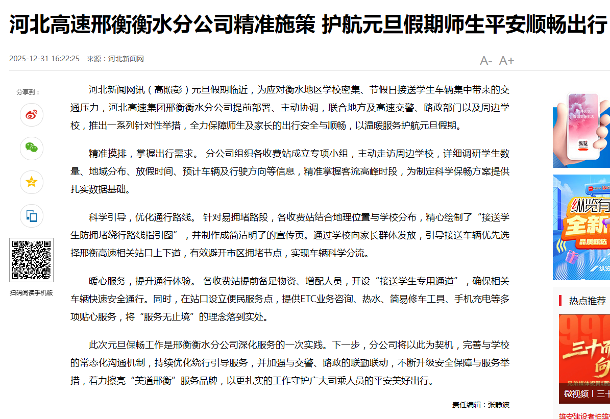 河北高速邢衡衡水分公司精准施策 护航元旦假期师生平安顺畅出行