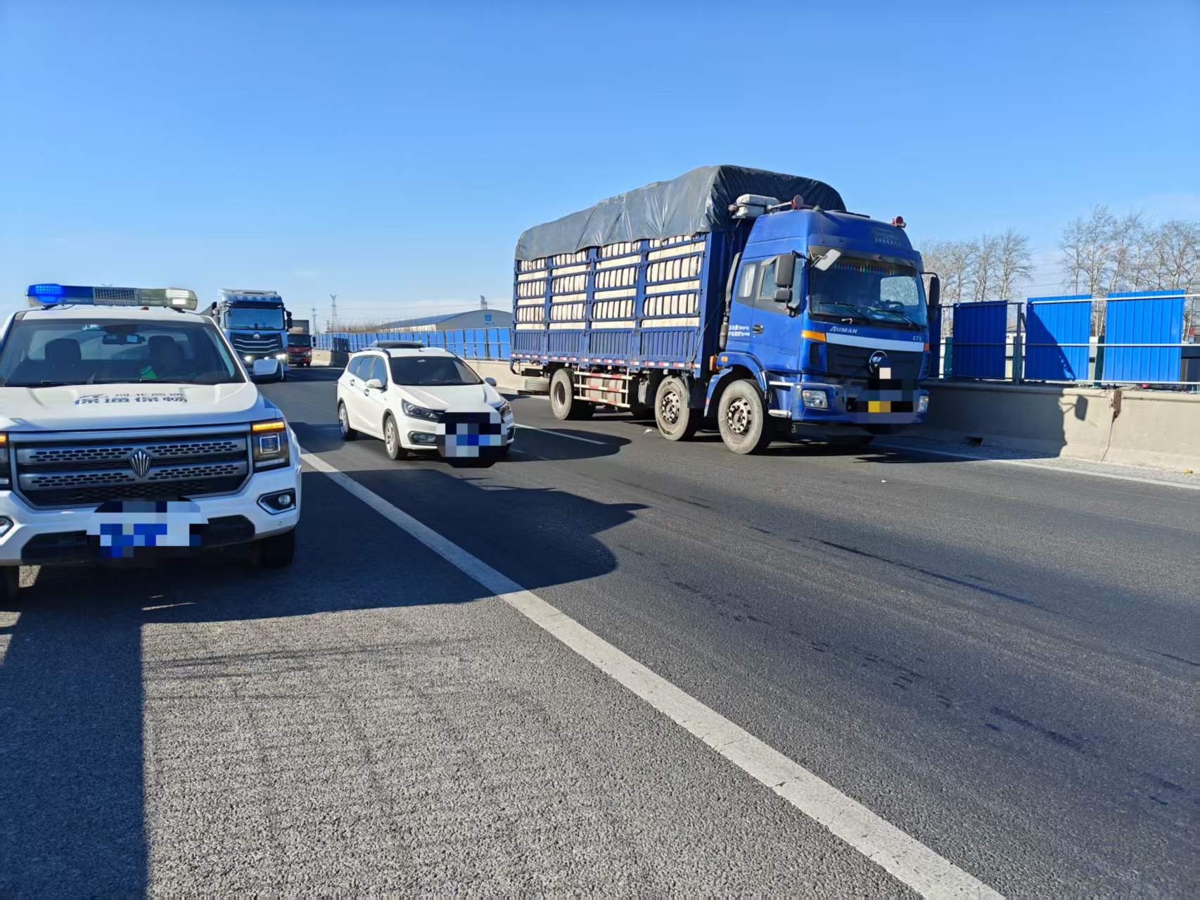 1月10日,广阳保通保畅应急大队在执行救援任务途中,发现一辆重型半挂车异常停靠在超车道,车身明显向一侧倾斜,后方车辆纷纷紧急变道,险象环生。