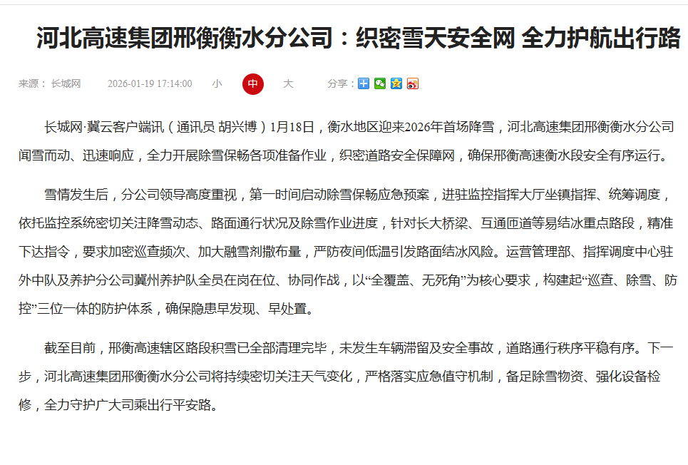 河北高速集团邢衡衡水分公司:织密雪天安全网 全力护航出行路