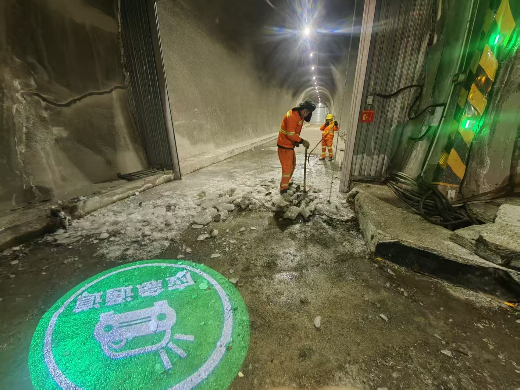 隐患就是命令,处置刻不容缓。发现这一情况后,双峰寺养护队立即组织人员、工具前往处置。首先在高速交警的指挥配合下对拱顶漏水导致挂冰位置进行了清除,避免了冰块坠落导致次生事故发生。其次,为避免温度过低导致挂冰漏水位置流入地面结冰,作业人员对地面结冰位置进行了清除,并撒布融雪剂避免结冰发生交通事故。最后,养护队人员针对隧道结冰情况,加强巡查,实施动态监测,密切关注隧道拱顶结冰情况,定时清除,切实消除安全隐患。