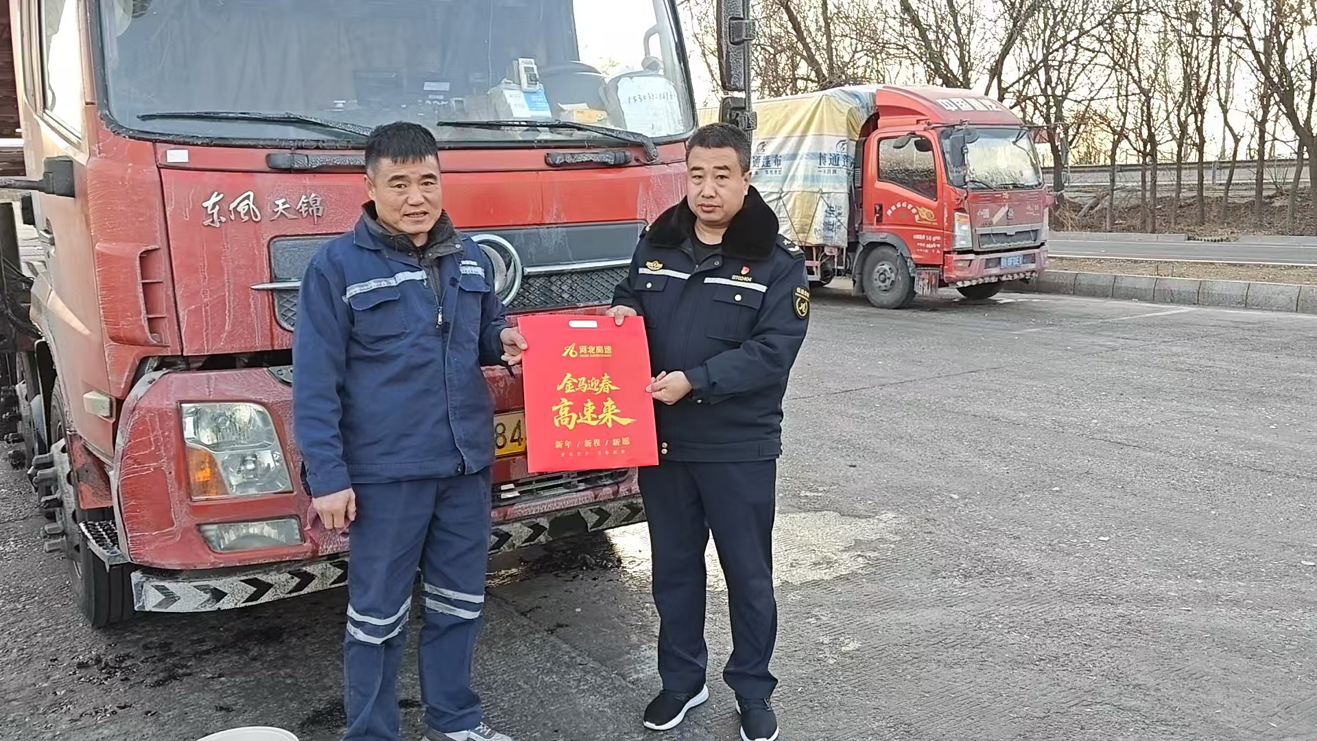随后,党员志愿者们赶到廊坊服务区。他们主动招呼过往司乘,引导车辆有序停靠后,微笑着递上春联,并送上新春祝福。在发放春联的过程中,他们结合实际案例,向不同类型车辆的司乘人员宣传春运行车安全知识。