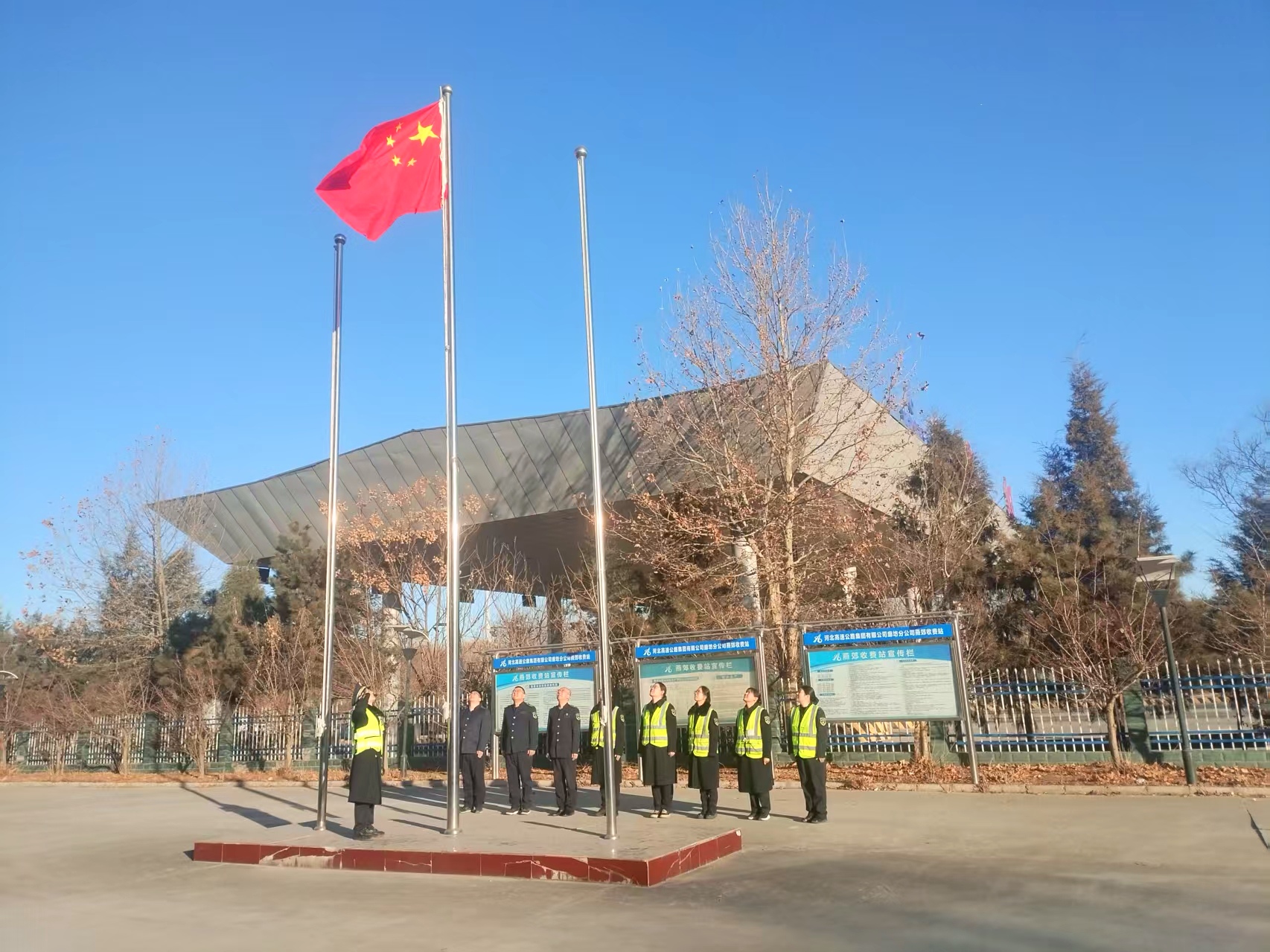 2月17日,农历大年初一清晨,廊坊分公司总部及所属各收费站、各大队同步举行庄严的升国旗仪式,以昂扬向上的精神面貌迎接农历新年,表达对伟大祖国的深深祝福和赤诚热爱,激励全体干部职工在新的一年里立足岗位、再建新功。