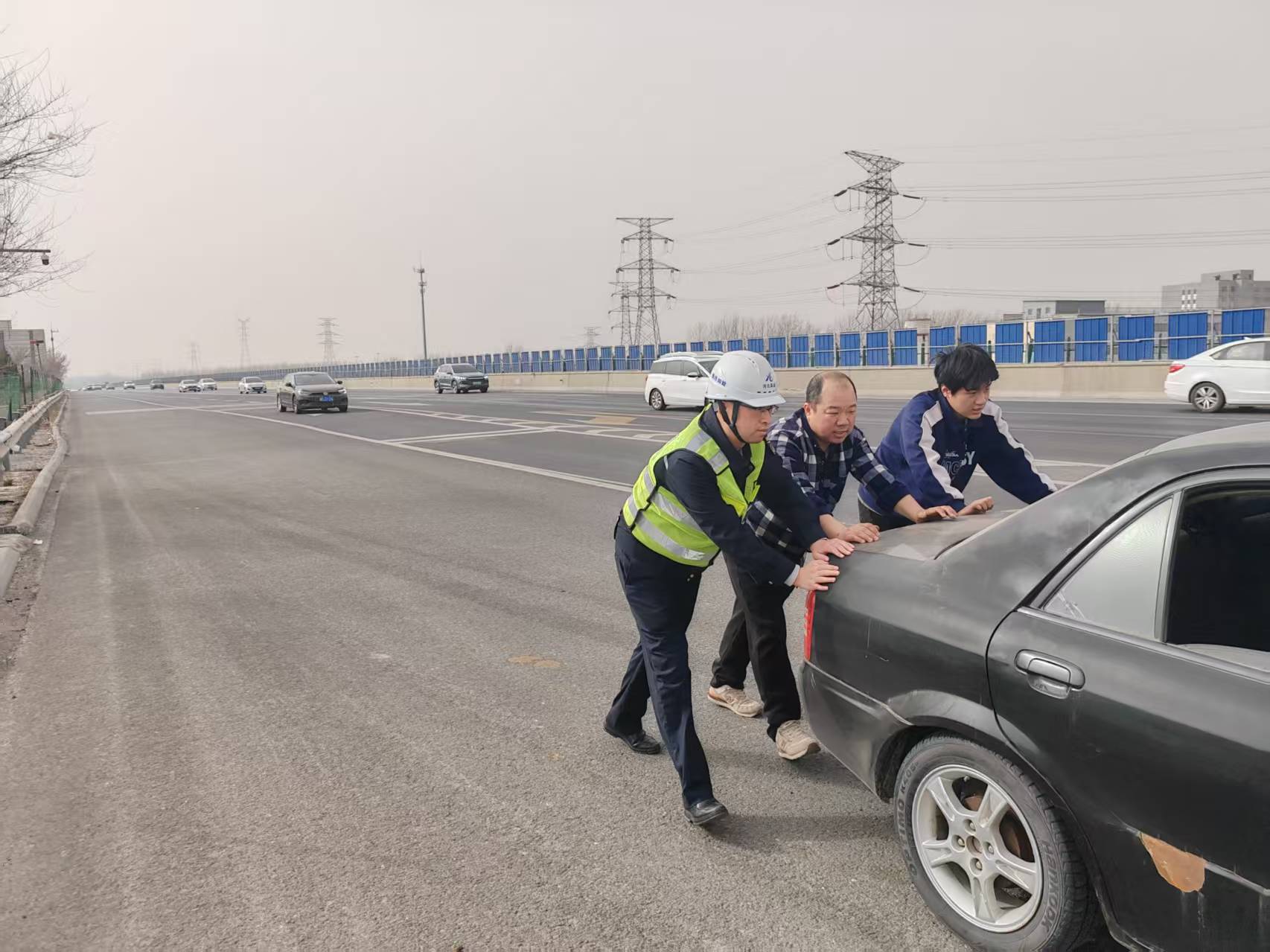 此时,保畅队员恰好在故障车辆前方约500米处进行预警定位作业。接到指令后,迅速跑步折返至故障车辆后方,与司机一起奋力将故障车辆推行至最近的高速出口。